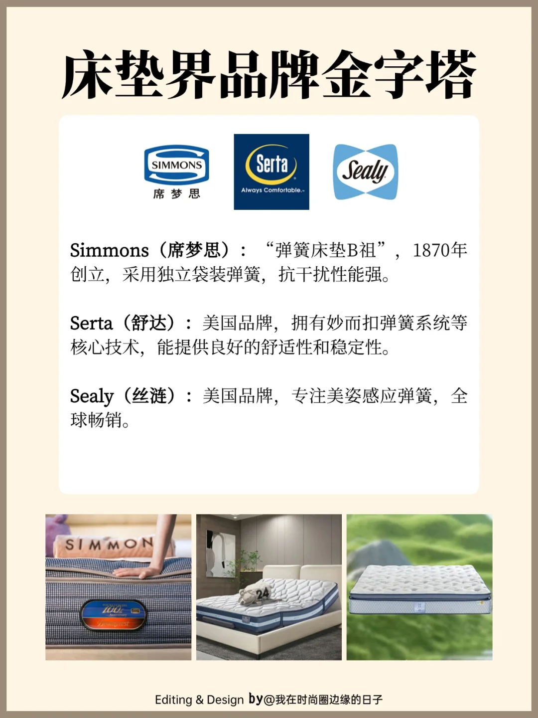 Simmons(席梦思):“弹簧床垫B祖”,1870年创立,采用独立袋装弹簧,抗干扰性能强。