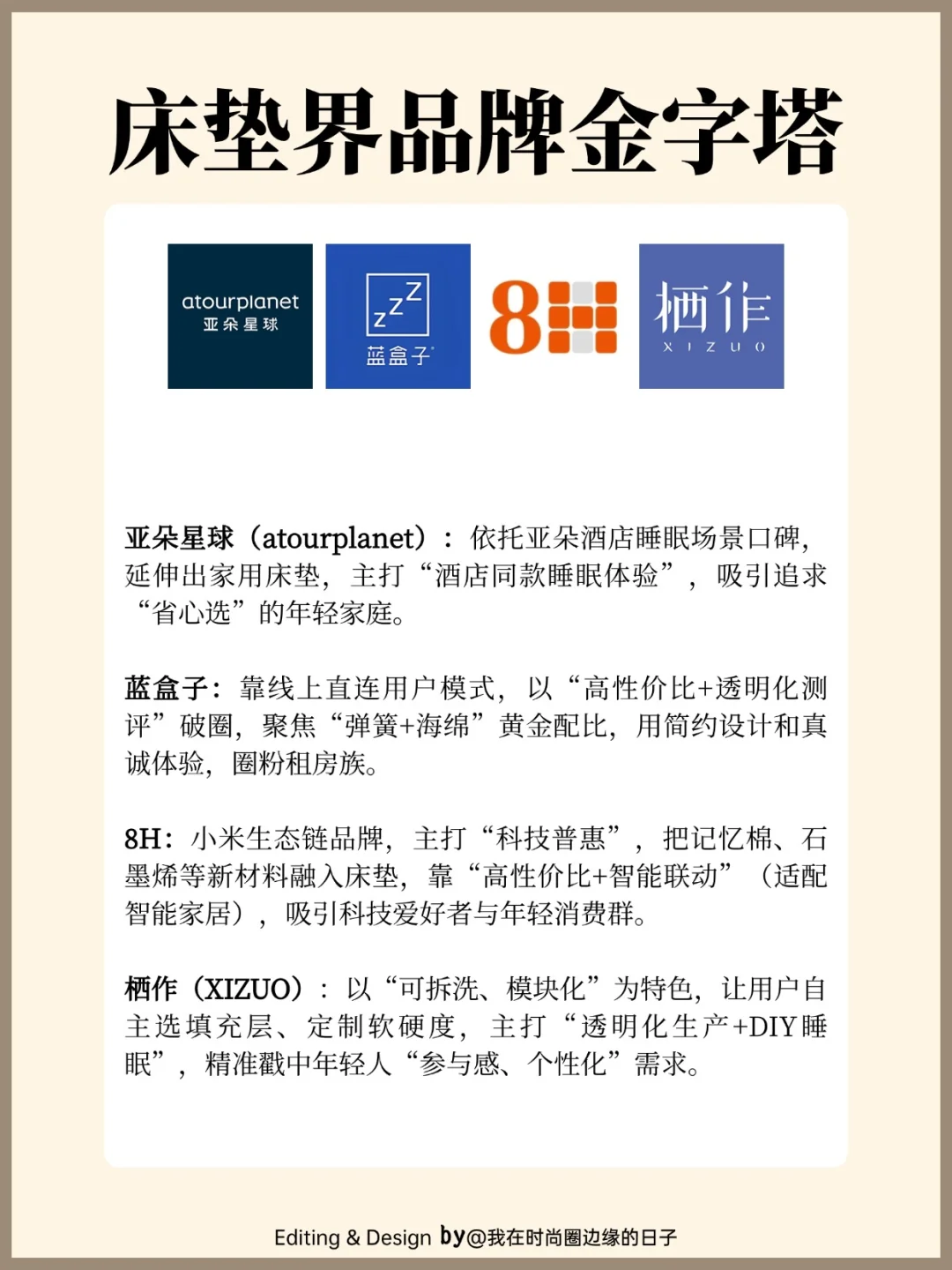 亚朵星球(atourplanet):依托亚朵酒店睡眠场景口碑,延伸出家用床垫,主打“酒店同款睡眠体验”,吸引追求“省心选”的年轻家庭。
