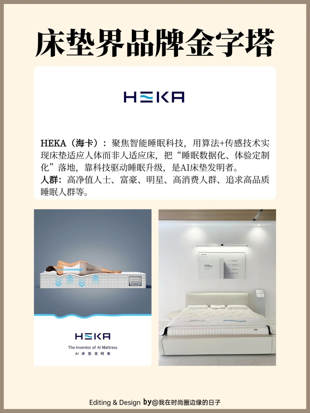 HEKA(海卡):聚焦智能睡眠科技,用算法+传感技术实现床垫适应人体而非人适应床,把“睡眠数据化、体验定制化”落地,靠科技驱动睡眠升级,是AI床垫发明者。