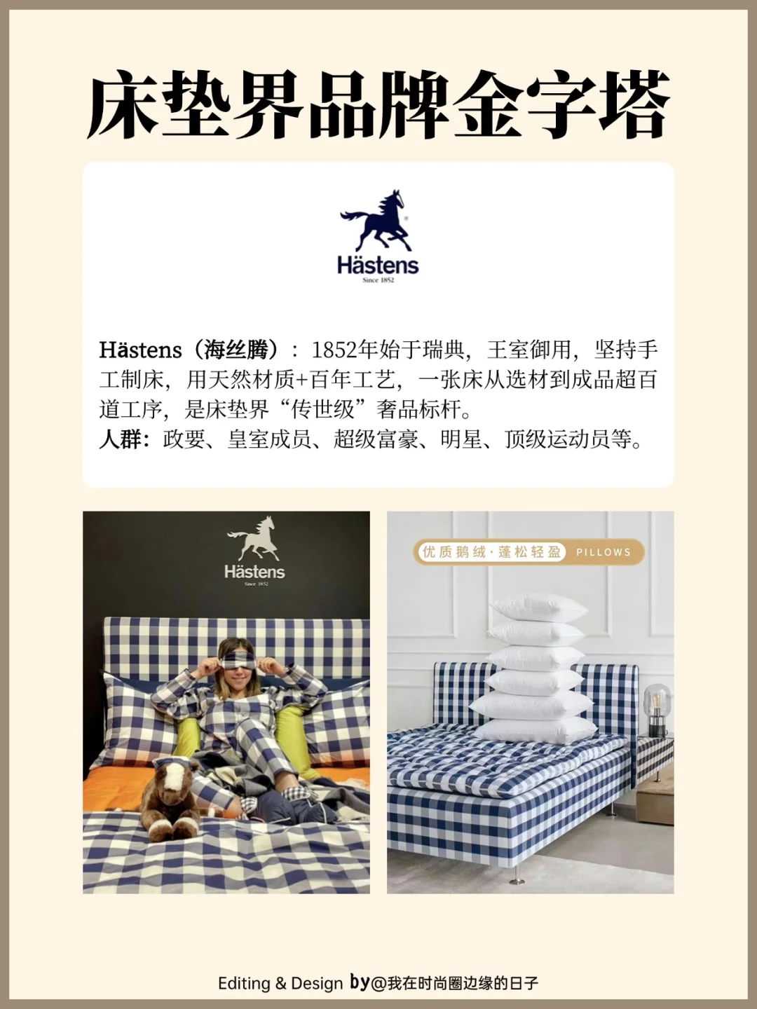 Hästens(海丝腾):1852年始于瑞典,王室御用,坚持手工制床,用天然材质+百年工艺,一张床从选材到成品超百道工序,是床垫界“传世级”奢品标杆。