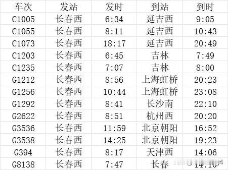 长春西站始发列车有13趟,开往长春站的列车,最长时间需要6小时23分 刚刚过去的9月28号,长春西站地铁2号线东延线以及沈白高铁开通运营,长春西站城市内通过地铁2号线向东可直达雾开河大街。城市外长春西站可通过高铁列车直通白山市、通化市、抚顺市等新开通高铁的地区。 而9月28日开行的G8138次列车,也是长春西站发往长春站的最长的时间的列车,全程需要6小时23分,绕行四平、铁岭、沈阳、抚顺、新宾、通化、白山、长白山等。 不仅有以上新增地区的车次,还有已经开行的至延吉西站,吉林站,上海虹桥站,长沙南站,杭州西站,北京朝阳站,天津西站等方向的始发高铁,长春西站作为长春市高铁枢纽之一,也发挥着越来越重要的作用。 除了列车车次开行方向有所变化外,列车的具体时刻也有所变化,具体通过铁路12306查询。