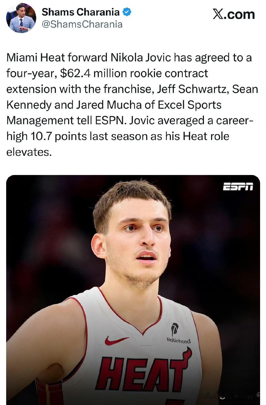 热火赚大了!!!约维奇4年6240万美元续约热火! 根据记者Shams最新消息透露:热火和前锋约维奇达成协议,双方提前完成续约,他得到的是一份4年6240万美元的大合同。 这笔签约又让莱利赚大了吧,很超值的续约,1500万左右的价格很香,约维奇之前在热火的戏份不多,随着热火开始送走巴特勒,约维奇也越来越受到热火的重视。 如今热火能够低价续约他也是双方的共赢局面,22年进入联盟的约维奇提前一年就获得了续约也是可喜可贺,这在新秀中也是可以很骄傲的了吧。 热火虽然没有了巴特勒,但是强硬是他们一贯的作风,新赛季面对多个强队球星受伤,热火也有了进入季后赛的机会。 恭喜约维奇,新赛季获得更多的机会,打出精彩的比赛,加油! 迈阿密热火 热火球员 nba热火队 热火 迈阿密热火