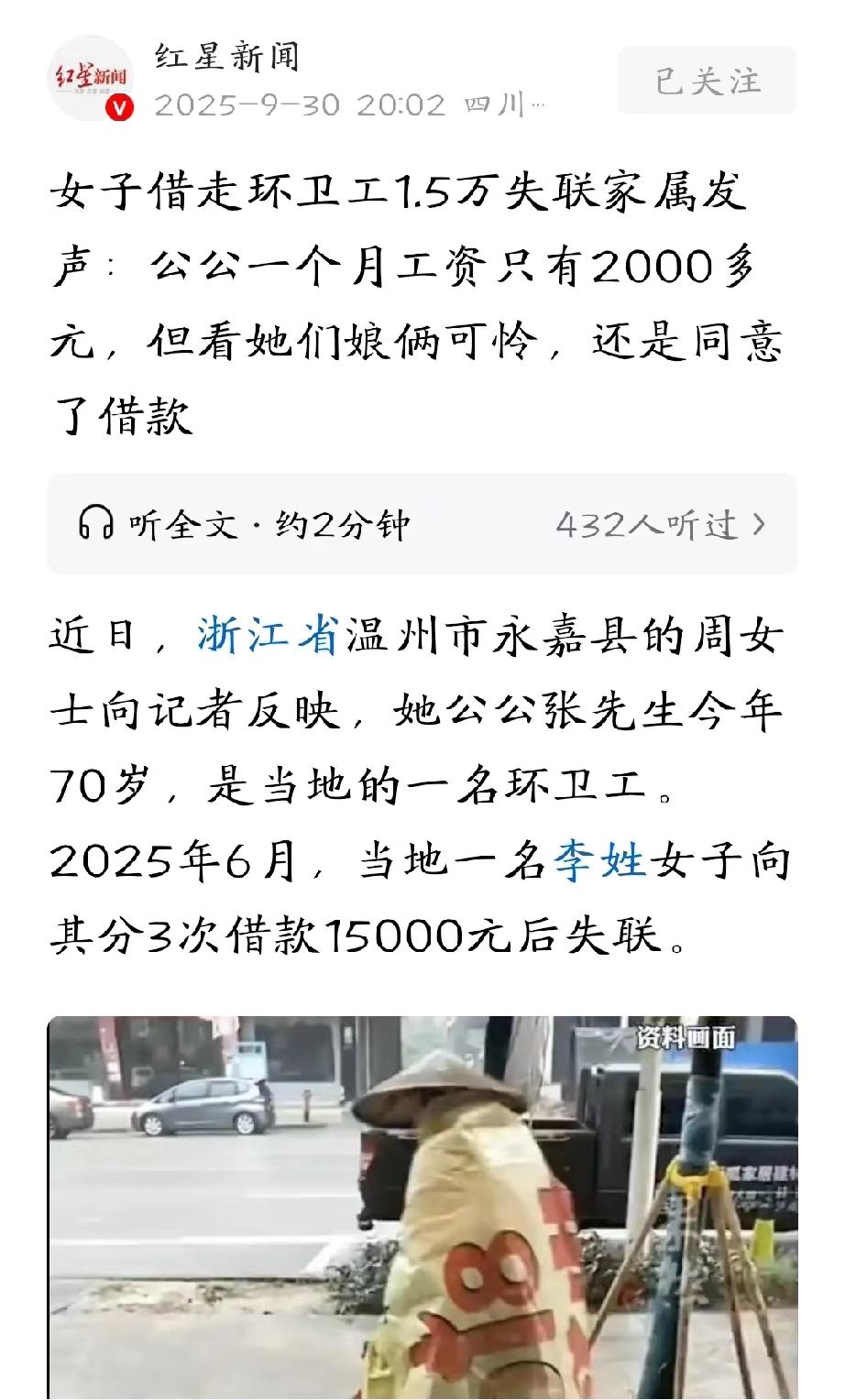 浙江温州,39岁离异女子以家人看病为由,多次找七旬环卫工大爷借钱。大爷虽然只有2000元的工资,但看女子可怜,竟一时心软,前前后后给她借款15000元。不料,借款到期后,女子迟迟不归还,大爷家属找女子讨债,女子以家庭困难为由,只给了一张欠条了事。事后,大爷家属得知,女子四处欠债,还玩起了消失,只能选择报警求助。民警:女子打了欠条,属于民事借贷纠纷,无法立案。 70岁的张大爷是一名环卫工,每天天不亮就推着清扫车出门,一个月2000多块的工资,是他生活的全部依靠。 谁能料到,这份省吃俭用攒下的血汗钱,会因为一次好心帮忙打了水漂。 2025年6月,张大爷正在清扫负责的街道,住在附近的李女士突然凑了过来。 39岁的李女士是离异带娃的状态,平时和张大爷也就点头之交,这次却红着眼眶说家里人出了车祸,急需5000块救命钱。 张大爷看着她着急的样子,又想起常看到她带着孩子进出,心里瞬间软了下来。 为了帮助李女士渡过难关,他没跟家里人商量,当天就从银行取了5000块给了李女士,还特意嘱咐先给人治病,钱不急着还。 可他没料到,这只是开始。 没过多久,李女士又找了过来,一会儿说医药费不够,一会儿说要给孩子交学费,连着又借了两次钱。 张大爷想着帮人帮到底,每次都把工资攒下的钱拿了出来,前前后后一共借了15000块。 直到约定的还钱日子过了好几天,李女士连个消息都没有,张大爷才慌了神,无奈的把这事告诉了儿媳周女士。 周女士一听,马上有种不好的预感,这些钱很可能肉包子打狗,有去无回了。 8月4日,周女士赶紧带着家人找到李女士,不料,李女士却一改之前的可怜模样,只说自己家庭困难,迟迟不肯提还钱的事。 一家人好说歹说,李女士才不情不愿地写了张欠条,承诺8月30日前还清15000元借款。 本以为李女士会良心发现,万万没想到 这只是她的缓兵之计。到了月底,李女士直接玩起了拖延战术。 周女士这才从邻居嘴里打听出,李女士早就欠了一屁股债,经常有人上门追着要账。更让人气愤的是,没几天李女士就偷偷搬了家,电话不接、消息不回,彻底失联了。 一想到公公张大爷平时连瓶矿泉水都舍不得买,省下来的钱全给李女士了,她竟然这么坑人,周女士又气又急。 后来,周女士还查询到,李女士早在2024年12月就被永嘉县法院列入了限制消费名单,看来这次借钱根本就没打算偿还。 9月底,周女士经过一番努力,实在找不到李女士的踪影,这才报警求助。 可派出所民警却表示,李女士写了欠条,这事属于民事借贷纠纷,不在公安管辖范围内,没法立案,只能通过法院起诉解决。 如今,想起当初真心想帮人的心意,张大爷怎么也想不通,自己的善意,怎么就变成了别人骗钱的机会。 首先,从法律角度来看,张大爷与李女士之间成立合法有效的民间借贷关系。 《最高人民法院关于审理民间借贷案件适用法律若干问题的规定》第九条规定:自然人之间的借款合同具有下列情形之一的,可以视为合同成立:(一)以现金支付的,自借款人收到借款时。 张大爷分三次以现金形式向李女士交付了共计15000元借款,李女士均实际接收,双方之间的民间借贷关系已依法成立。 后续李女士出具的欠条,明确记载了借款金额与还款日期,进一步固化了双方的债权债务关系。 有人质疑,民警为什么不按照诈骗罪对李女士立案追究呢? 《刑法》第二百六十六条规定:诈骗公私财物,数额较大的,处三年以下有期徒刑、拘役或者管制,并处或者单处罚金;…… 诈骗罪的构成需以行为人具有非法占有目的,并实施虚构事实、隐瞒真相的行为为核心要件。 民警未予刑事立案,关键在于现有证据暂未达到诈骗罪的认定标准。 李女士出具了欠条,该行为通常被视为认可债务、具有还款意愿的表现,与典型诈骗中逃避债务的初始心态存在区别。 虽然李女士虚构了家人车祸、孩子交学费等借款理由,且事后失联,但她在借款时是否自始无还款意愿仍需进一步举证。 在无法证明李女士非法占有目的的情况下,民警依据存在欠条的特征,将其界定为民事借贷纠纷,符合刑民分界的审慎原则。 《民事诉讼法》第九十五条规定:受送达人下落不明,或者用本节规定的其他方式无法送达的,公告送达。自发出公告之日起,经过三十日,即视为送达。 针对李女士失联的情况,张大爷可向被告住所地法院提起民间借贷纠纷诉讼,通过司法程序主张权利。 法院受理后,若无法联系到李女士,可依法采用公告送达的方式送达起诉状副本、开庭传票等法律文书,公告期满即视为送达。 即便李女士无正当理由拒不到庭,法院也可缺席判决。 若张大爷胜诉后李女士仍不还款,可立即申请法院强制执行,通过查询其财产线索、采取限制消费、纳入失信被执行人名单等措施,最大程度维护自身权益。 张大爷一片好心错付,大家有什么好办法呢?