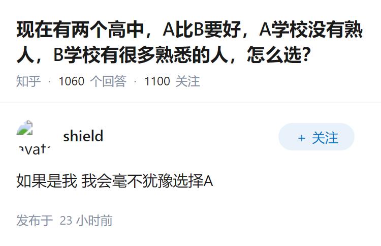 现在有两个高中,A比B要好,A学校没有熟人,B学校有很多熟悉的人,怎么选?