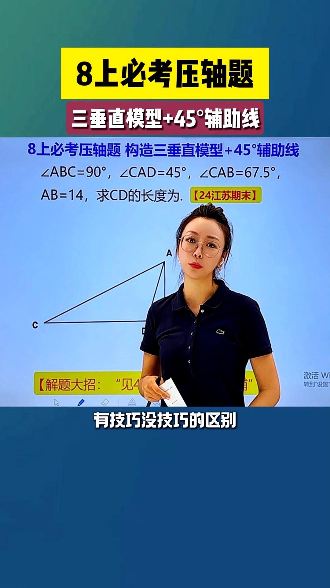 14厘米线段秒变28厘米,孩子靠的不是算得快,是会“搭梯子” 八年级月考压轴题,全班九成空白,小卓也卡了十分钟。 他把67.5°劈成45°和22.5°,在草稿纸上添一条垂线,搭出一个“三垂直”小架子,AB=14一下子翻成CD=28。 老师把答案写在黑板时,他才发现自己没多写数字,只是让图形“站”了起来。 很多人以为几何靠天赋,其实缺的是模型储备:看到45°就想到等腰直角,看到直角连一排就想到K型全等,套路熟了,难题就像提前给好台阶,一步就跨上去。 中考压轴越来越爱把几个模型叠一起,谁平时把模型当积木玩,考场就能迅速拼出通路。 别再把刷题当砍柴,学会把每一道错题拆成零件收进盒子,下次遇到新题,你也能让14翻倍。 把模型装进脑袋,考场上就能让数字自己长大。