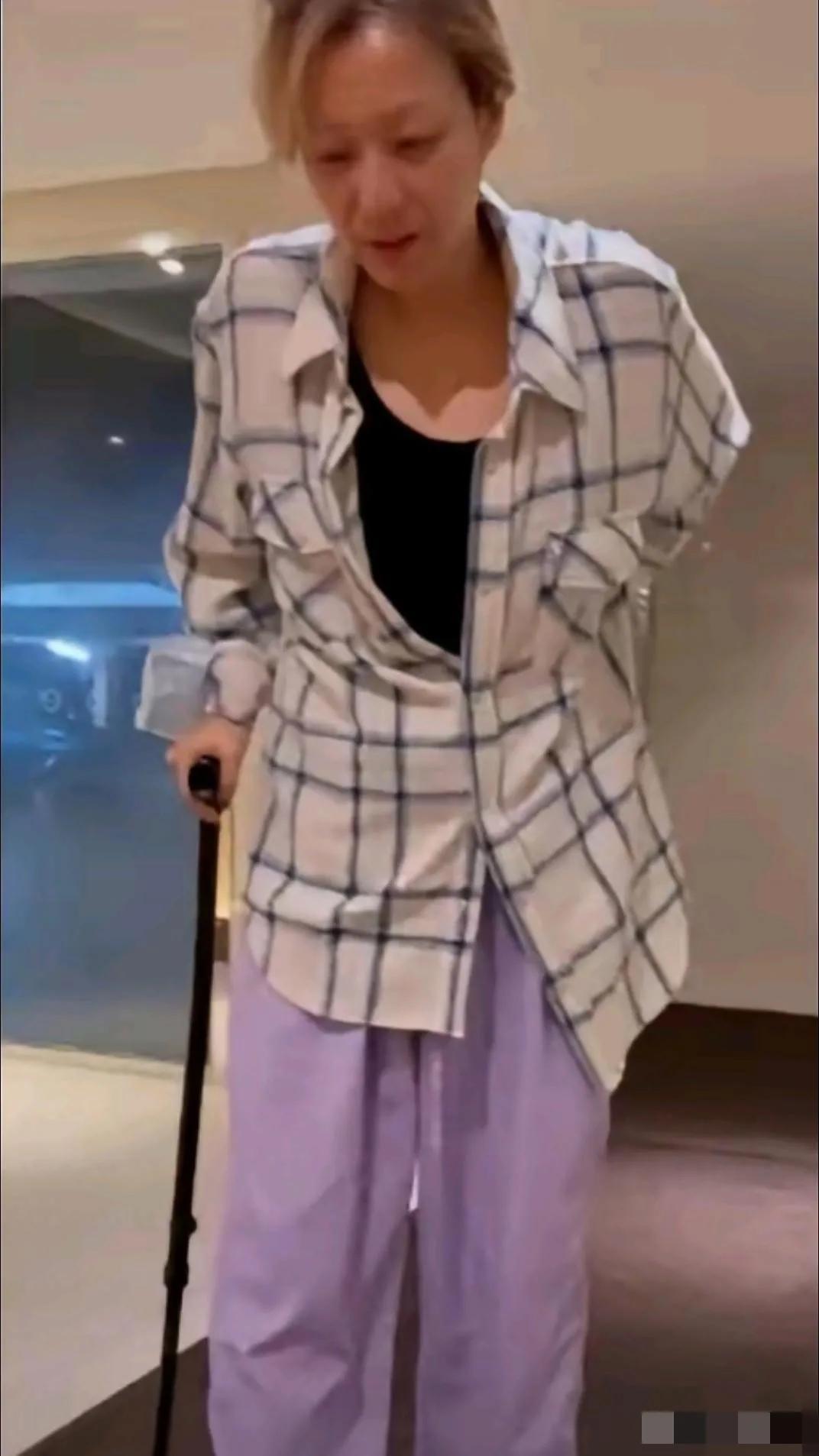 郑秀文在运动中不小心伤了腰,近日能拄着柺仗行走了,素颜的她面黄肌瘦,平板身材,眉秃眼肿,老态尽显呀,你看是吗?