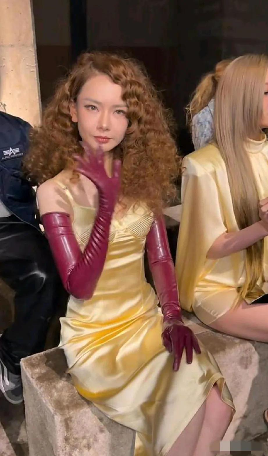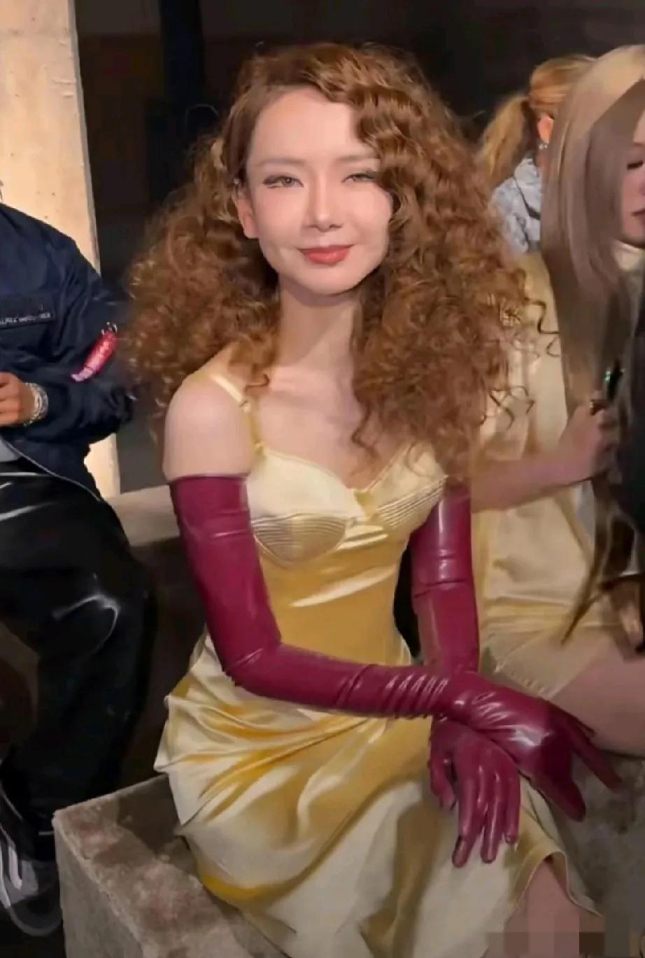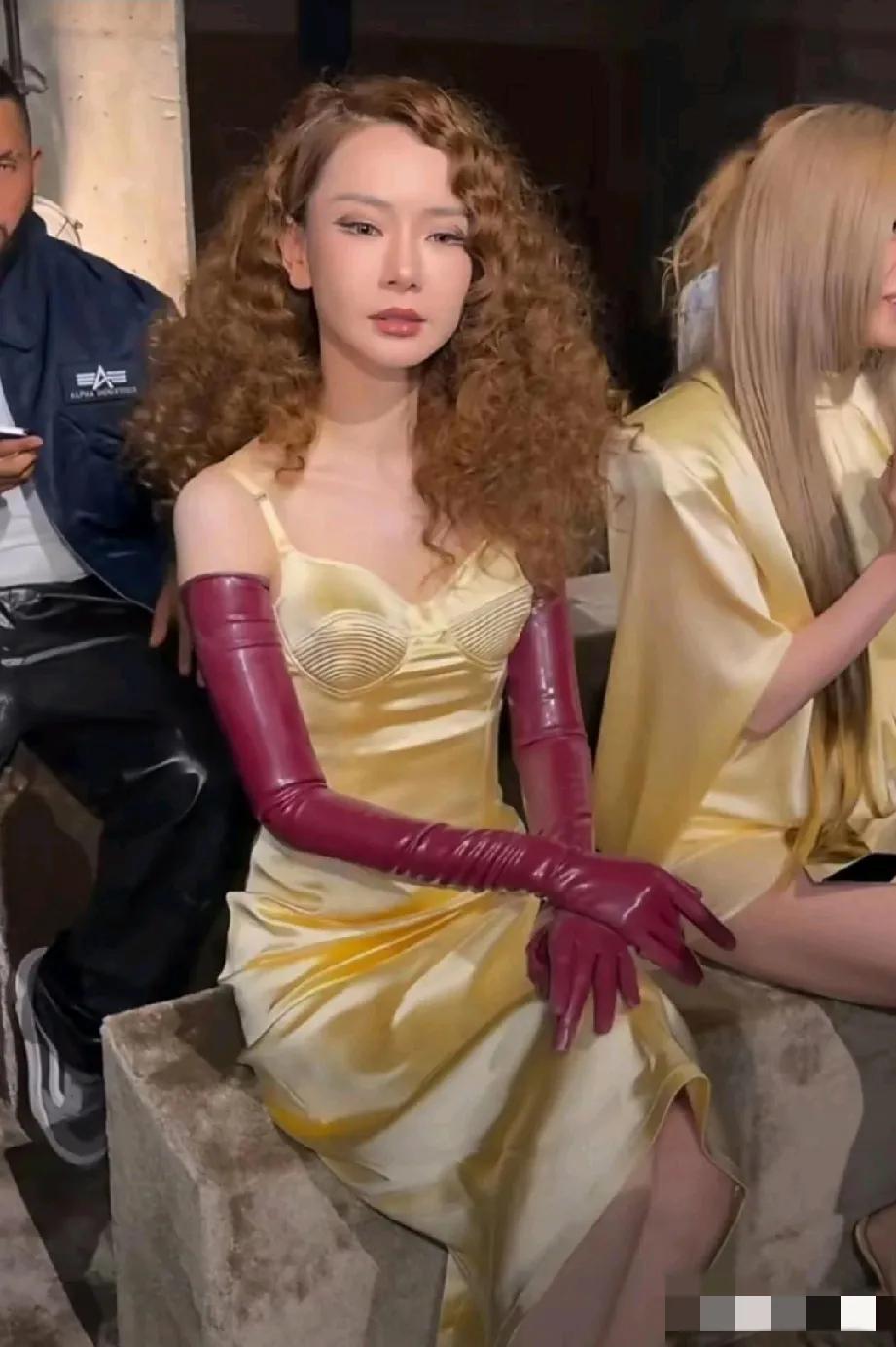 戚薇米兰看秀造型:一头金色羊毛卷垂肩,一件黄色吊带裙裹身,一副紫色手套紧箍玉臂,身材平板,横眉立鼻,金色美瞳抢镜,看上去不但不显洋气,反而因瘦骨嶙峋更显老气,你觉得呢?