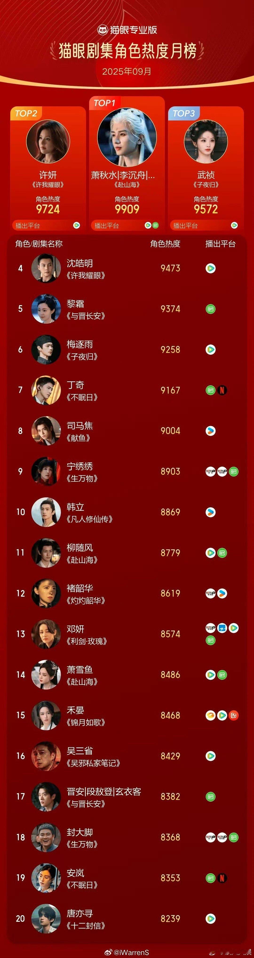 成毅萧秋水登顶9月猫眼角色热度榜成毅萧秋水猫眼角色热度月榜top1成毅萧秋水登顶9月猫眼角色热度榜,厉害,[送花花][送花花]
