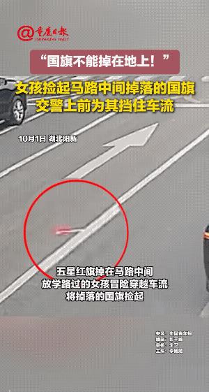 这就是祖国的未来,祖国的希望! 10月1日这天,湖北阳新一名小学生在放学回家的路上看到一面手持小小国旗掉在了马路中间,当即作了一个决定,一定要拾起这面国旗,不能让车辆碾压。 当小女孩冒险走到马路中间捡起小国旗的那一瞬间,也被不远处的交警看见了。 为了确保小女孩的安全,交警快步跑到小女孩身边,向司机们做了一个暂停的指令,然后将小女孩护送到马路对面。 小女孩面向警察叔叔非常认真地说道:“我看见一面国旗掉在了地上,我决定要把它捡起来,因为国旗不能掉在地上”。 警察叔叔说:“你做的对,我们不能让国旗掉在地上”。 虽然这只是一个小小的举动,却把小朋友的爱国情怀体现的淋漓尽致!这就是中国为什么越来越强大的原因。 今年是新中国成立76周年,全国各地到处都插满了五星红旗旗来祝福祖国繁荣昌盛。 同时也请大家爱护手中的小国旗,乱扔国旗不仅仅是对先烈的不敬,也是对祖国妈妈的不敬,我们也不希望小朋友因捡国旗而受到任何的伤害!