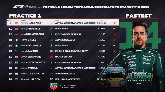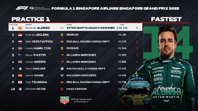 F1新加坡站一练:阿隆索登顶,勒克莱尔维斯塔潘排二三