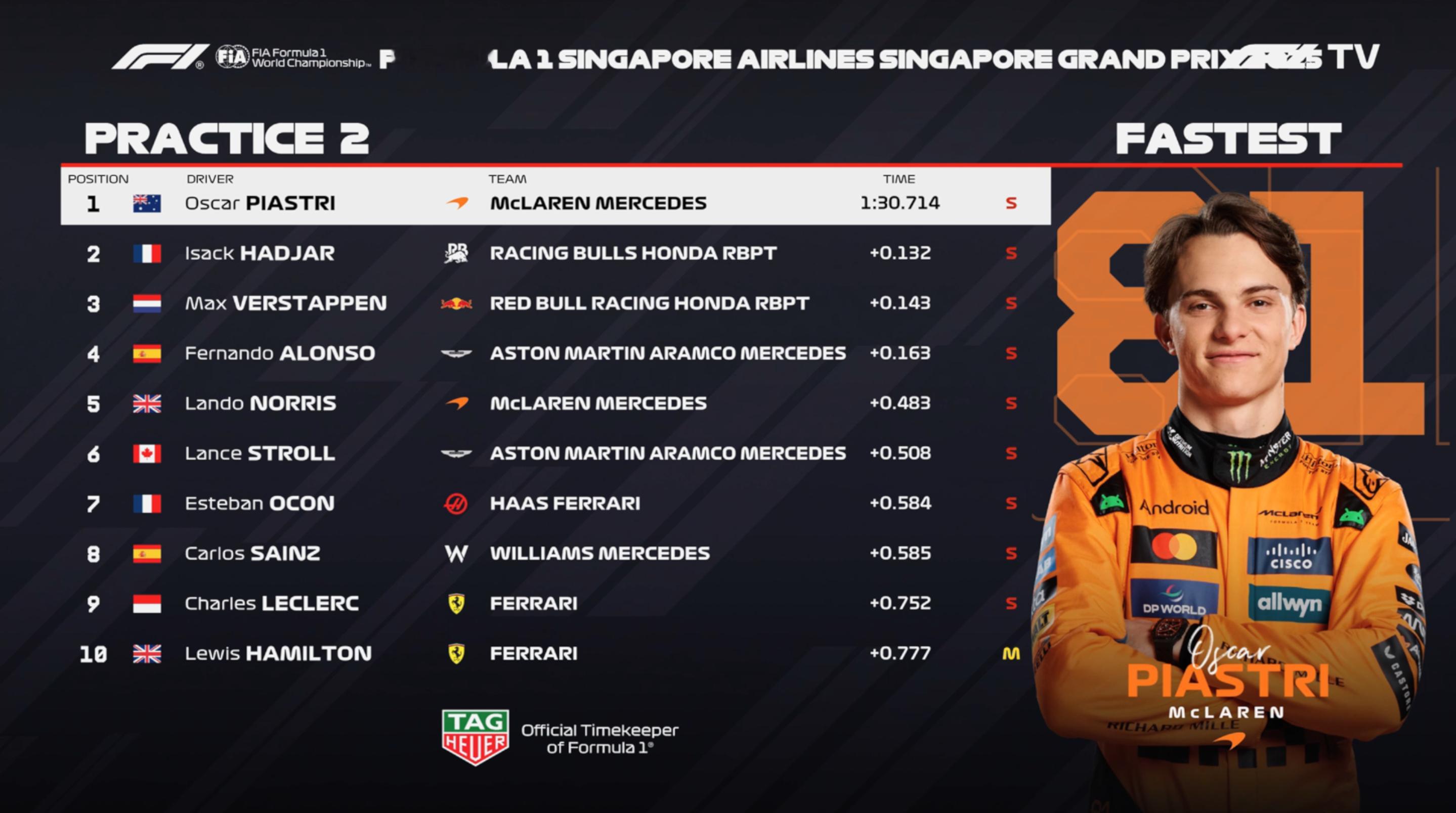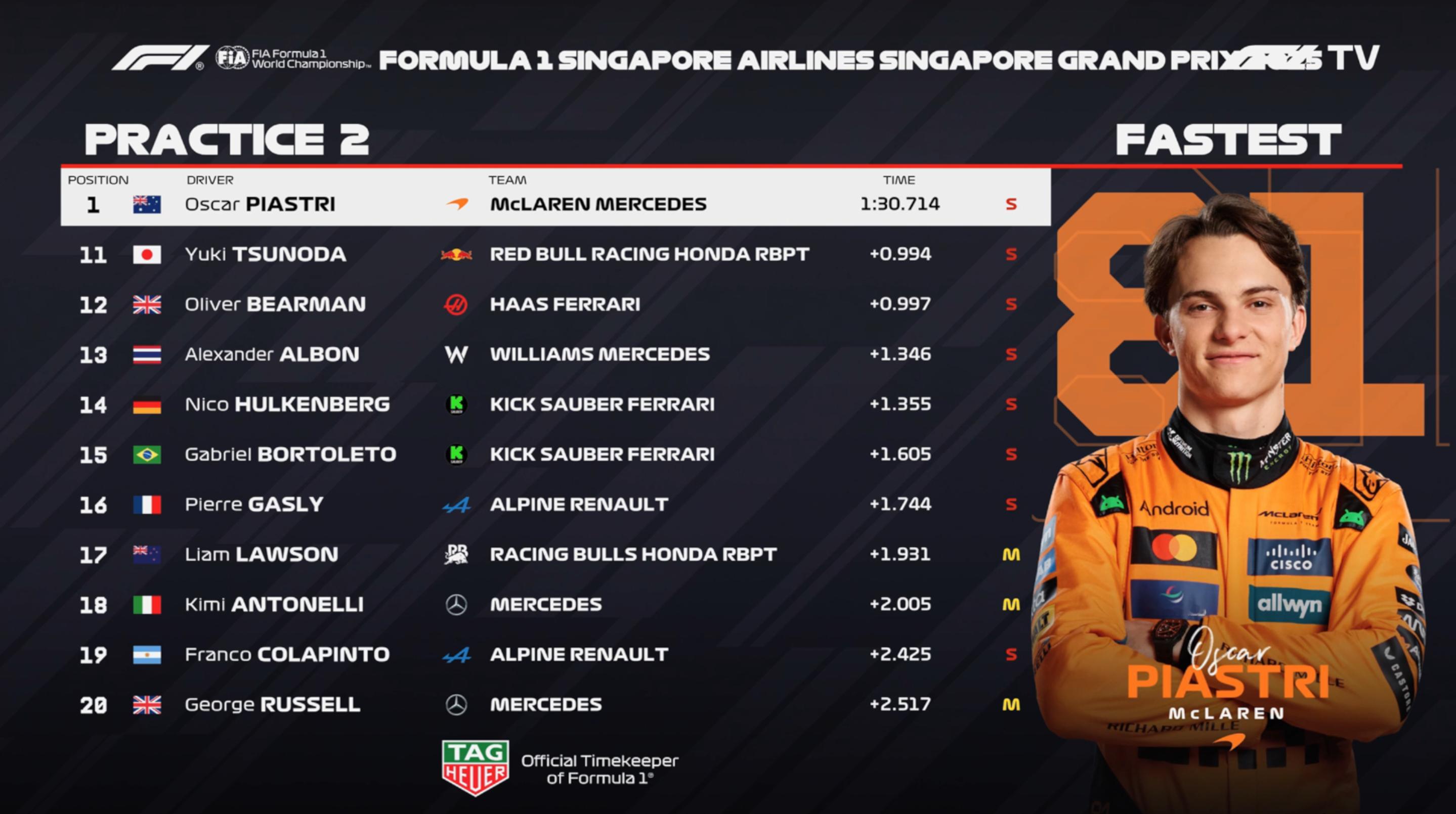 F1新加坡站FP2成绩:皮亚斯特里最快,哈贾尔P2,维斯塔潘P3
