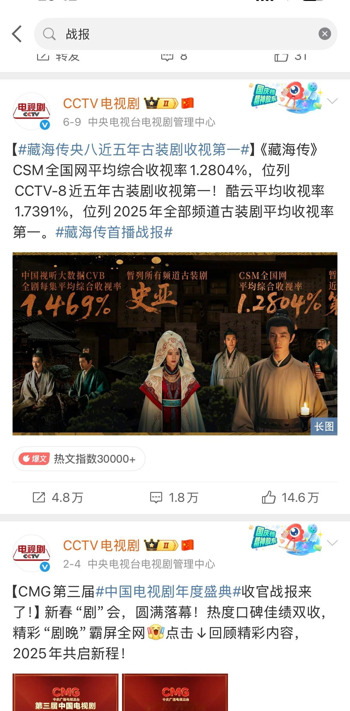 CCTV8近3年发布的电视剧收视率战报只有《梦中的那片海》和《藏海传》 肖战版射雕收视登顶 肖战射雕英雄传实时收视率破2