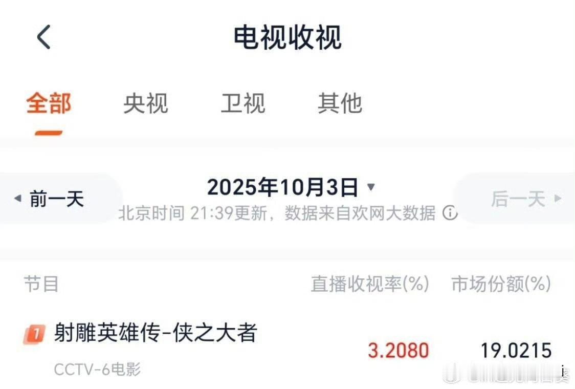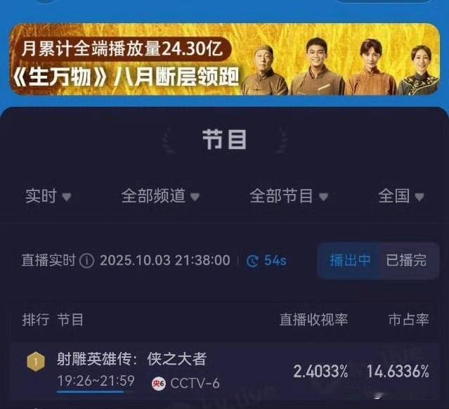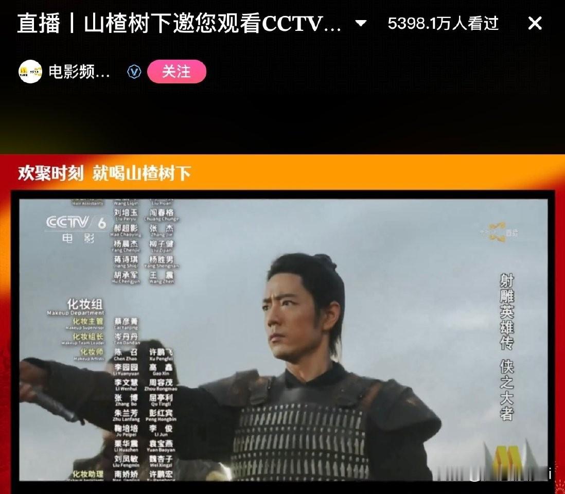 肖战《射雕英雄传侠之大者》今日央视首播,收视率2.4%登顶收视第一,城网收视率3.2%,直播间近5400万人收看,这就是经典电影的魅力和号召力