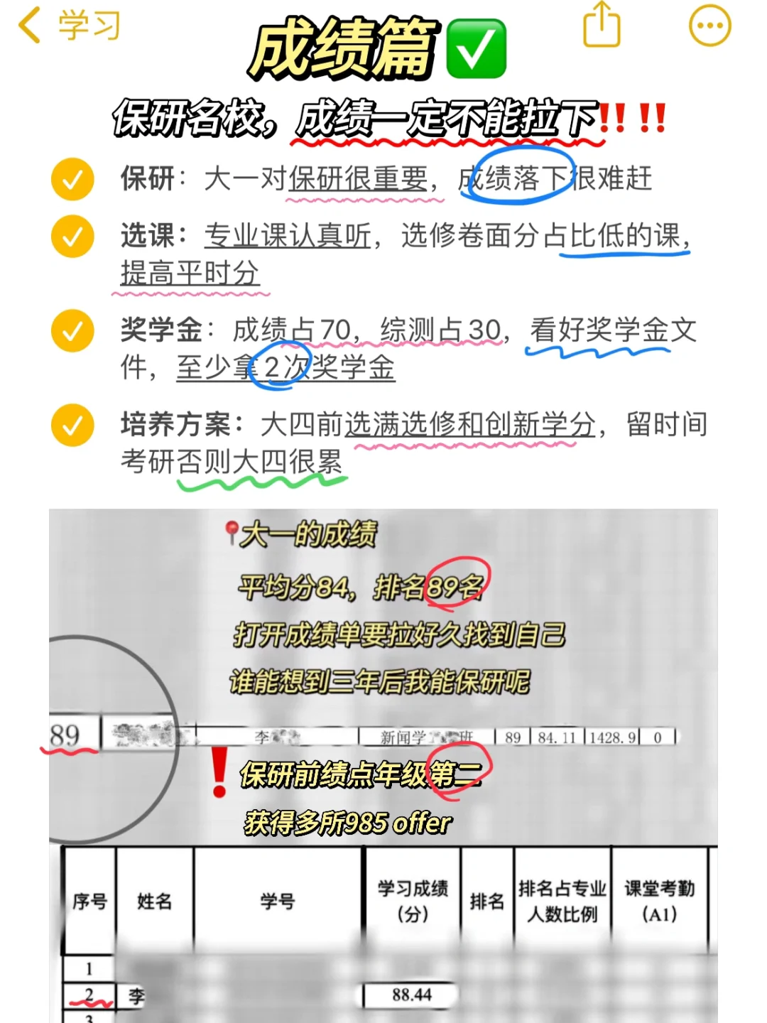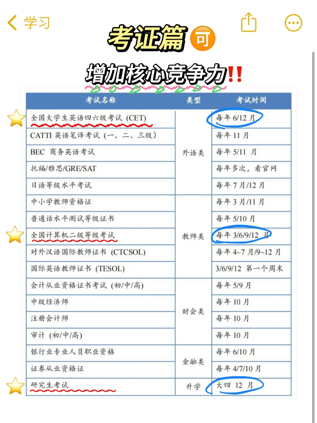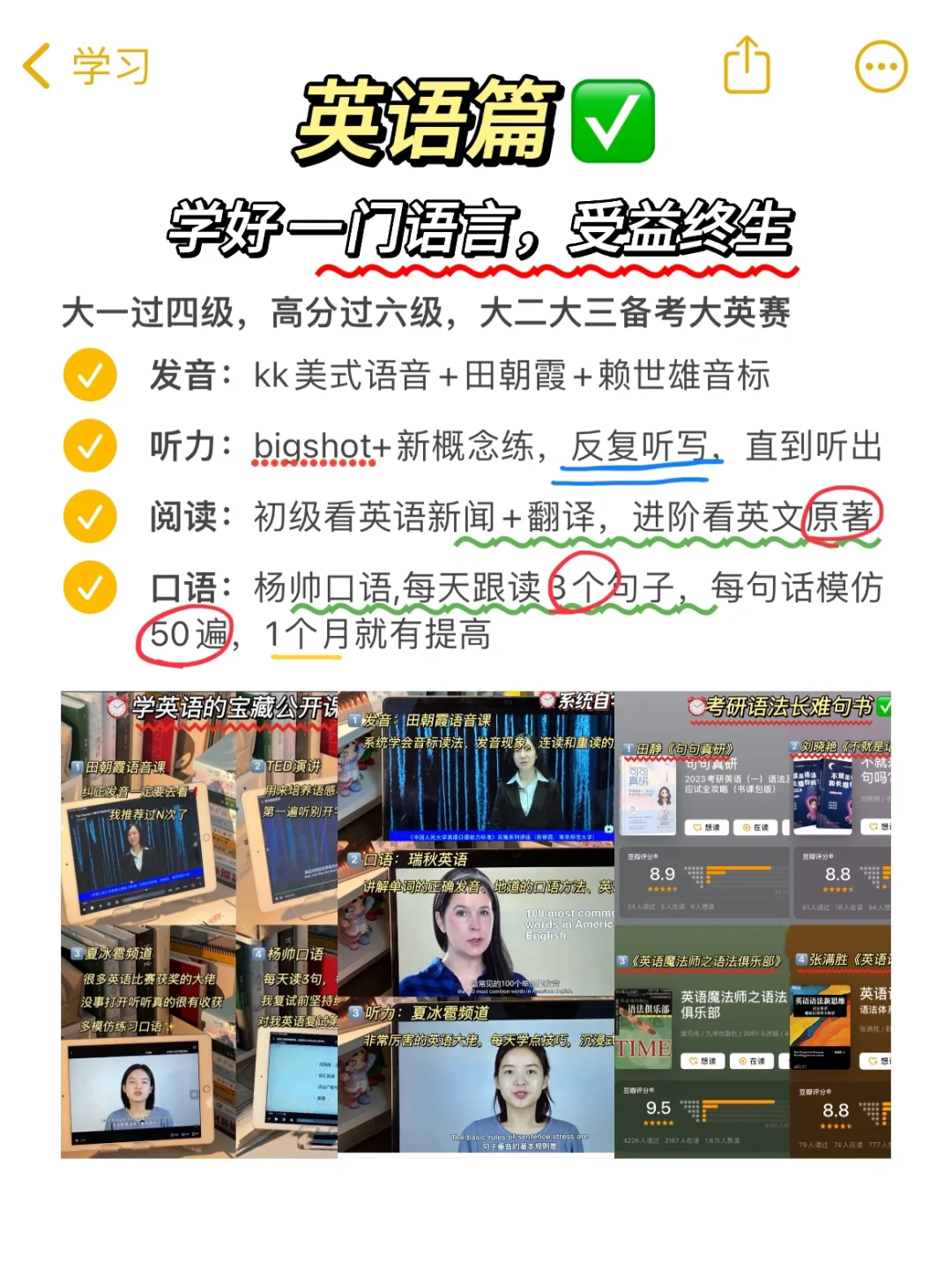 Hi,我是大头学长,二本上岸北外研究生的普通男生🎓 · 大一时我处于“失控”状态: 参加了很多社团,却一个技能都没学精 期末认真复习背书,却只考到专业89名 . 但我发现: ①国奖学姐没认真复习,却考到专业第1,因为她认真做好每次课程论文; ②水课不认真听,因为用来把四六级刷到600+。搞懂「没课时间才是拉开差距的关键」后,我也考到专业前3,考上研究生✅ · 1.规划篇🔵 ❶提高绩点:积极回答问题+平时作业做好拿满平时分,对保研很重要,落下很难赶 ❷学好专业课:专业课做好笔记,大四考研会轻松很多,看3-5本名著 ❸拿1次奖学金:成绩占70,综测占30,吃透奖学金文件,普通学生考研复试能把握的唯一奖项 ❹报名暑期社会实践:报名三下乡等实践,认真做1个项目,大二参加比赛和大创 · 2. 考证篇🟢 ①四六级:6/12月 ②教师资格证:3/11月 ③计算机证书:3-12月 ④普通话:5/10月 ⑤CATTI笔译:11月 ⑥审计/注会证:10月 ⑦法律资格证:9/10月 . 3.比赛篇🔴 ❶大英赛:4月,大学最简单比赛,刷题就行 ❷大创:12月,复试看重科研,这是做科研蕞简单方法 ❸大挑:3月,权威学术竞赛,拿奖大学起飞 ❹互联网+:3月,很多学校拿奖能保研 ❺其他:大广赛、外研社杯竞赛、创青春、服务外包大赛、学院奖 . 4.技能篇🟢 ❶办公:旁门左道ppt,拉小登excel,课堂展示和求职会用到 ❷剪辑摄影:摄影看林海音,剪辑看影视飓风+南门录像厅,修图看敬伟+你的不秃头 ❸数据分析:王佩丰excel透视,戴戴师兄SQL、Lin的学习笔记 ❹自媒体副业:池骋《放大》、黄有璨《运营之光》 . 5.英语篇🔵 ❶单词:利用艾宾浩斯曲线科学记忆 ❷听力:烤鸭tv+新概念英语+ted演讲,一小段反复练,直到听出s ❸发音:周育如音标+田朝霞发音+瑞秋英语,先看2遍音标再学发音现象 ❹口语:杨帅口语+玛丽莲馒头+夏冰雹频道,每天读3个句子读50遍,相信我1个月就有提高 ❺雅思扫盲:王卷王雅思,我大学时花了很久备考雅思,系统提高英语后研究生面试第1,还在实习面试逆袭。按每人bg提供zhen断书了解情况,定制备考规划老师指哪就打哪,有目标有方向,不用盲目备考