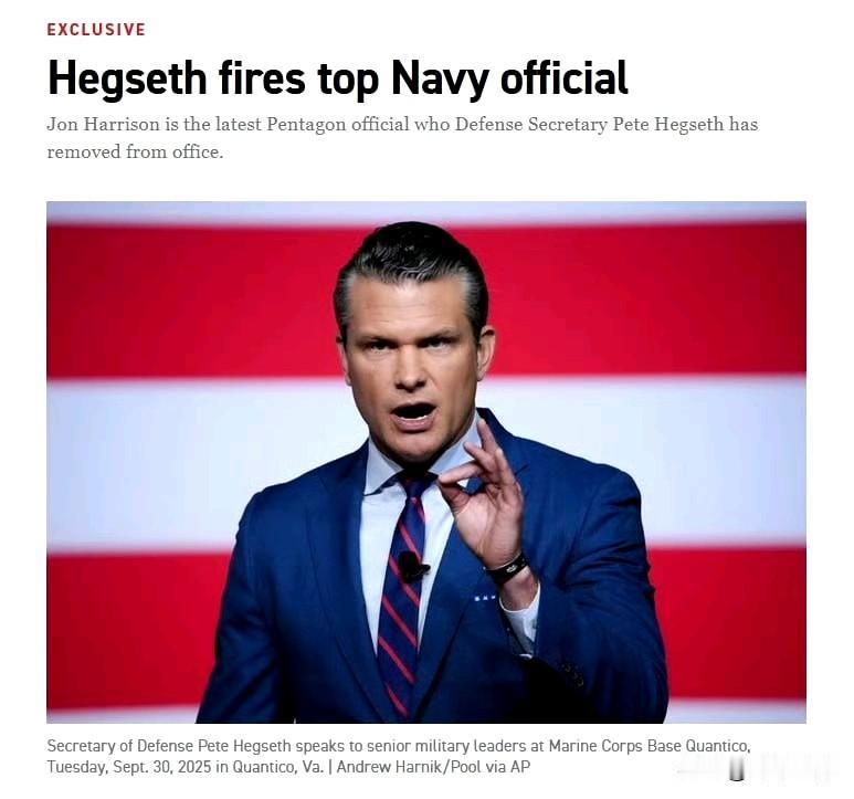 据Politico报道,战争部长皮特·赫格塞斯周五解雇了海军参谋长乔恩·哈里森 这是烽火戏诸侯之后美国第三位高级将领去职