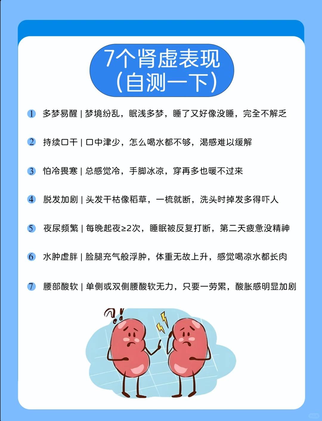 7个肾虚表现,你中了几条? 1️⃣ 多梦易醒|梦境纷乱,眠浅多梦,睡了又好像没睡,完全不解乏 2️⃣ 持续口干|口中津少,怎么喝水都不够,渴感难以缓解 3️⃣ 怕冷畏寒|总感觉冷,手脚冰凉,穿再多也暖不过来 4️⃣ 脱发加剧|头发干枯像稻草,一梳就断,洗头时掉发多得吓人 5️⃣ 夜尿频繁|每晚起夜>2次,睡眠被反复打断,第二天疲惫没精神 6️⃣ 水肿虚胖|脸腿充气般浮肿,体重无故上升,感觉喝凉水都长肉 7️⃣ 腰部酸软|单侧或双侧腰酸软无力,只要一劳累,酸胀感明显加剧