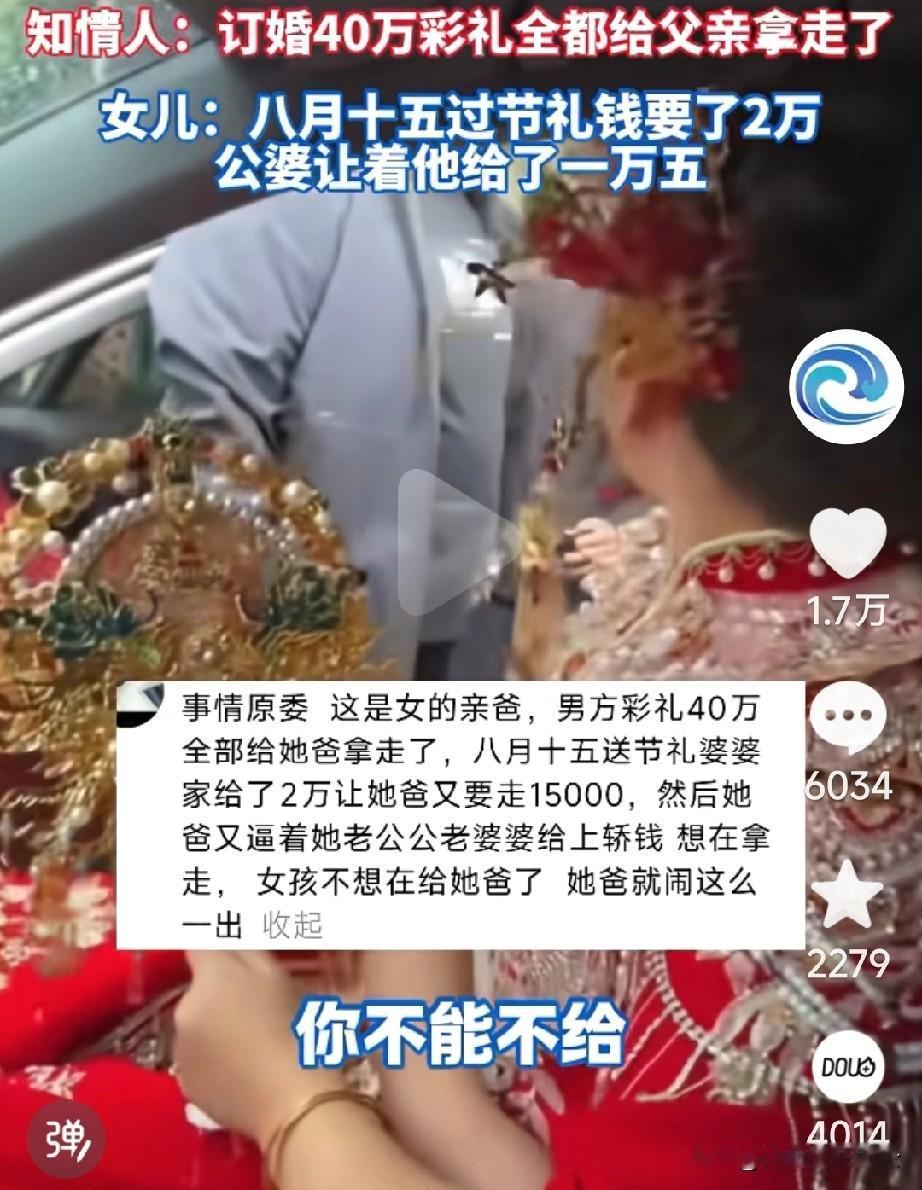 遇到这样的老丈人怎么办?感觉就是无底洞啊! 网上一段视频,闺女结婚当天,她父亲拦在婚车旁不让走。理由是必须让她公婆再拿上轿钱。 女孩被这个亲爹气的不行,她说公婆给的40万彩礼,全让她爸拿走了。就连八月十五公婆给她的两万块,也让她爸拿走了一万五。现在又来要钱,不能给了。 新娘爸爸一听自己闺女跟他对着干,顿时火冒三丈。他骂完闺女,拦在车子面前,不管怎么说,你们不给钱就是不能走。 有这样的父亲,这个女孩也够可怜的,她父亲这是把她当摇钱树了,能多要一点是一点。可是男方家里给了40万彩礼,确实也不少了。还在要,也太贪得无厌了。 有人说,是不是还有个儿子,给儿子要钱结婚呢。可是儿子结婚,是你们父母的事,你为难别人算什么?这样要钱,你闺女嫁到婆家还有地位吗?你怎么不为女儿考虑考虑呢? 男方也是,遇到这样的老丈人也够倒霉的。如果不是新娘通情达理,真不建议娶了。 有网友说,这次把钱给了,以后别来往算了,小两口好好过日子。 对于这件事,你怎么看呢?这钱该不该给?