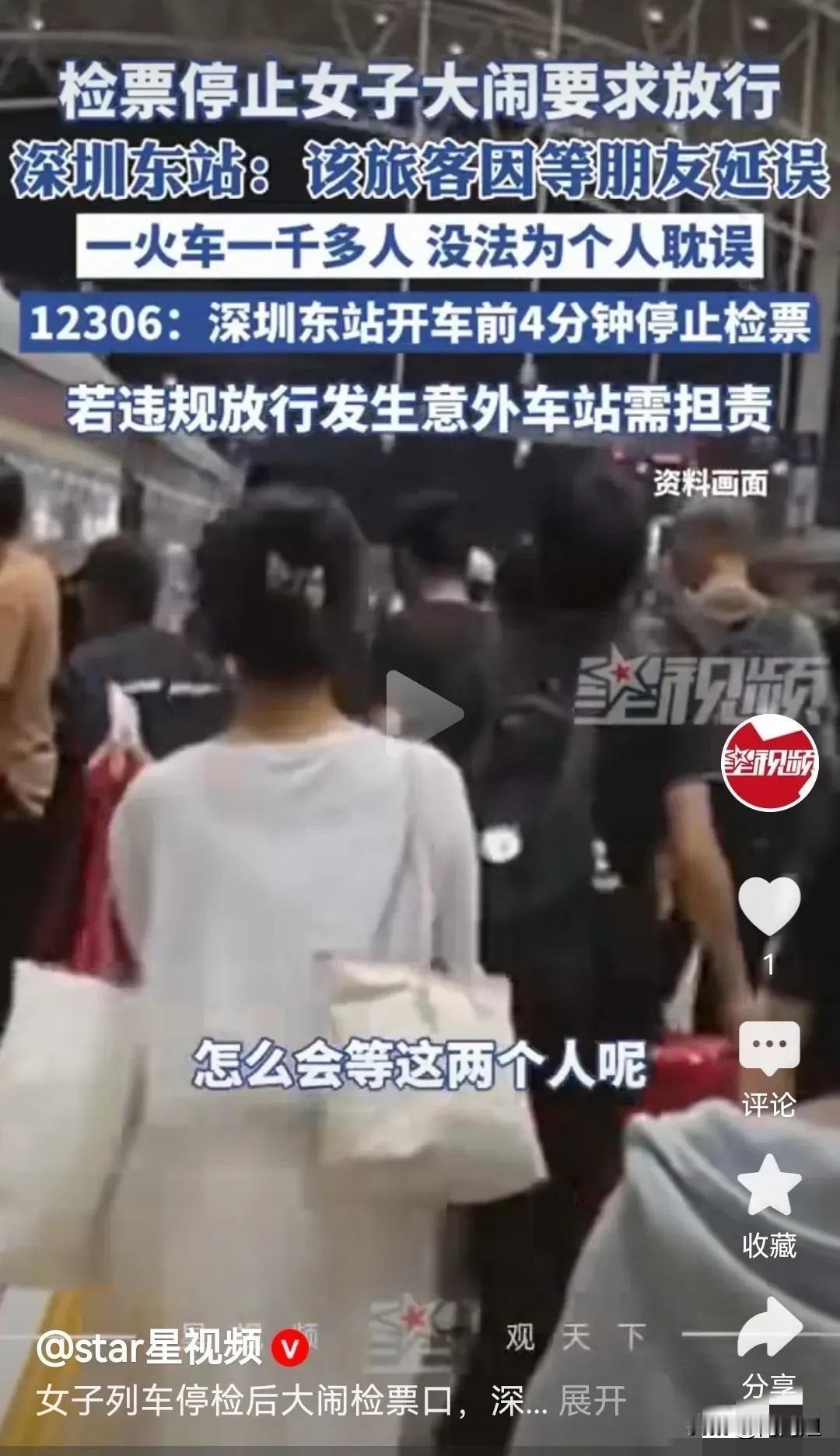 这种朋友还能交吗? 两女子女子因为赶不上高铁大闹车站,要求放行。而奇葩的是,一女子是提前到车站的,但是为了等另一女子错过了检票时间。 信息来源:星视频 网友评论: 16年我在北京坐高铁,7点07分的火车,7点我还在地铁上,等我到检票口时已停止检票了,检票员让我进去了,一上火车就关门了,好紧张,差几秒钟就乘不上了 拉入黑名单,终身禁止乘坐高铁! 现在不懂规矩,不遵守规矩,反而无理取闹的人大有人在,这是社会的悲哀,为什么会这样? 一次在广元站换乘,和下趟车相隔20分钟。一个刚入职的工作人员坚决不让我走换乘快捷通道,使我这个七十多的老头上下楼来回跑了十多分钟还是没赶上趟,我找到一个五十多岁的工作人员帮我,他不仅帮我换好了票,还叫那个年轻的不准我走快捷通道的工作人员给我扛行李,送到车上找好了座位道了歉才完事!