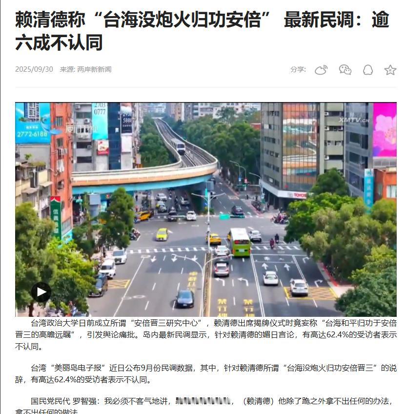 赖清德表示,中国大陆的武力迅速扩张,到今天为止,没有一枚炮弹打到台湾省,这都要归功于日本前首相安倍晋三。说白了,中国大陆不对台湾省动用导弹,那不是因为中国大陆,不想给无辜的台湾民众带来伤害吗?,跟安倍晋三有啥关系。 中国大陆的对台政策从来都是明摆着的。我们一直坚持和平统一,不是因为怕谁,更不是因为哪个外国政客的“高瞻远瞩”。核心原因再简单不过,两岸同属一个中国,台湾同胞都是我们的骨肉兄弟。 谁愿意对着自己人动刀动枪?导弹飞过海峡,炸伤的是中国人;炮火落在岛上,受苦的是中华儿女。这种血浓于水的情感,是任何外部势力都没法理解的,更不是安倍晋三之流能左右的。 赖清德为了捧安倍,还扯出了“四方安全对话”“奥库斯”这些名头,说都是安倍促成的。这说法直接被台湾学者打脸了。“五眼联盟”1956年就有了,安倍1954年才出生,难不成他还在娘胎里就操盘国际联盟了?“奥库斯”2021年成立时,安倍早就卸任首相,这功劳怎么算也轮不到他头上。 更讽刺的是,赖清德嘴里的“台海宁静和平”,在台湾民众眼里根本是另一回事。他上台之后,两岸关系一天比一天紧张,“兵凶战危”的感觉越来越强烈。他自己搞不定两岸关系,对美谈判又处处碰壁,就只好拉个死去的外国政客垫背,说到底就是为了掩盖自己的无能。 这种媚日的嘴脸,已经不是第一次出现了。之前他就跟着日本侵略者的调子,把抗战胜利说成“终战”,连“光复节”都绝口不提。要知道,日本殖民台湾半个世纪,犯下的罪行罄竹难书,多少台湾同胞为了反抗殖民抛头颅洒热血。 现在赖清德反倒把殖民者的后人当成“和平恩人”,这种扭曲历史的做法,简直是对先烈的亵渎。台湾《联合报》的社论说得狠,这就是依附日本军国主义的思路,是典型的后殖民意识在作祟。 岛内的民调最能说明问题。针对他这番谬论,超过62%的台湾受访者表示不认同。国民党民代罗智强直接怒批,说他除了“跪”根本拿不出别的办法。网友们看得更透彻,有人直言“台海本无事,有人要搞事”,这“搞事”的,不就是赖清德这些想“倚外谋独”的人吗? 安倍晋三生前确实鼓噪过“台湾有事就是日本有事”,但这根本不是在维护和平,而是在插手中国内政,是在给“台独”势力递刀。这种做法只会加剧台海紧张,哪谈得上什么“守护和平”? 赖清德心里比谁都清楚,“台独”这条路走不通。他不敢直面大陆的善意,也搞不定岛内的民生问题,就只能把希望寄托在外国势力身上。可历史早就证明了,靠外人撑腰的“独立”,从来都是镜花水月。 夏潮联合会会长陈福裕说得好,民进党当局为了“倚外谋独”,连两岸同胞共同抗日的事迹都要抹杀,这不仅是亵渎先人,更是侮辱台湾人民。台湾的前途命运,从来都掌握在两岸中国人自己手里,轮不到外国人指手画脚。 国防部新闻发言人张晓刚早就戳破了这种谬论。他明确指出,赖清德之流媚日恋殖、倒行逆施,实在令人不齿。在抗战胜利80周年、台湾光复80周年的节点上说这种话,更是忘了本、丢了魂。 现在的情况很清楚,赖清德越是把和平归功于外人,越说明他心里没底。他搞的这些政治操弄,不仅骗不了民众,还让两岸关系越来越危险。超过六成台湾民众不满意他处理两岸关系的表现,这就是最真实的民意。 台海和平的根基,从来不是什么外国政客的阴谋诡计,而是两岸同胞的共同心愿,是大陆始终坚持的和平统一方针。赖清德想靠抱外国大腿来给自己壮胆,最终只会把台湾推向危险的深渊。 这种颠倒黑白、媚日恋殖的言论,早晚会被钉在历史的耻辱柱上。台湾民众要的是实实在在的安宁,不是这种靠吹嘘外国政客换来的虚假和平。 信源:新华社《史观错乱,背叛民族——赖清德和民进党媚日谬论遭台湾各界挞伐》