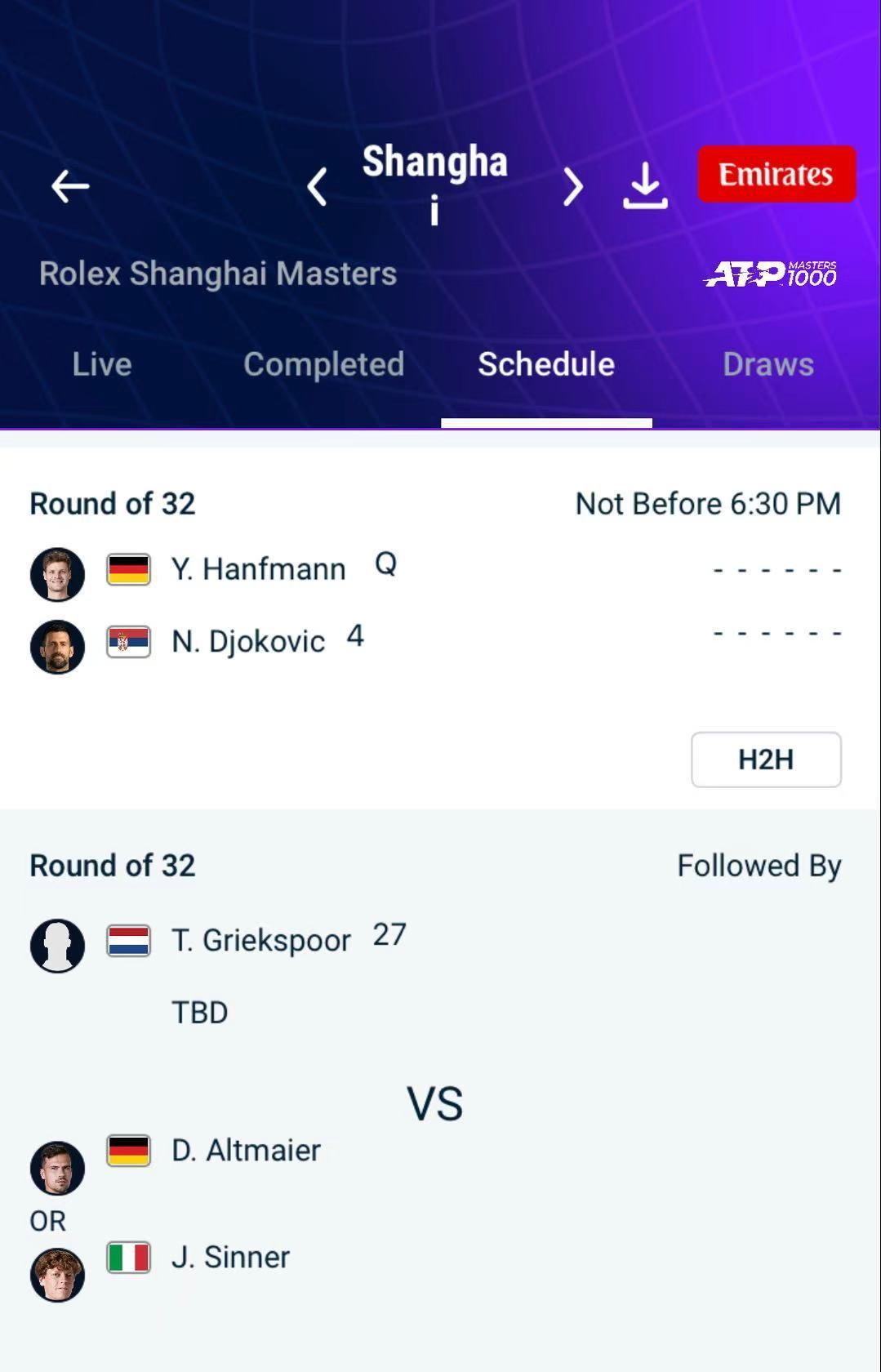 2025上海劳力士大师赛第三轮,小德 vs 汉夫曼,中心球场夜场第一场,不早于北京时间10/5号周日18:30分 idemo nole