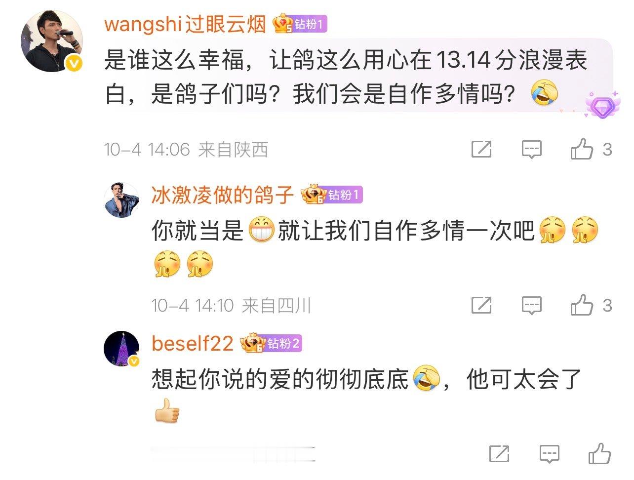 杨宗纬卡点1314发文 发文“天空蓝得彻底,看不见一朵云。跑哪去了?跑进你同样蓝得彻底,的心里。” 好浪漫的一段描述,还卡点了13:14,是在告白粉丝么[哈哈]