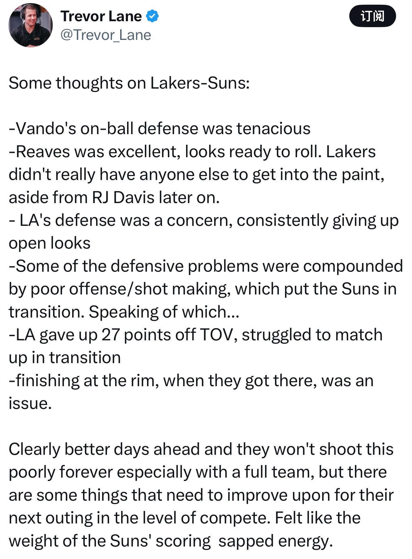 湖人记者Trevor Lane分析今天湖人太阳的比赛: