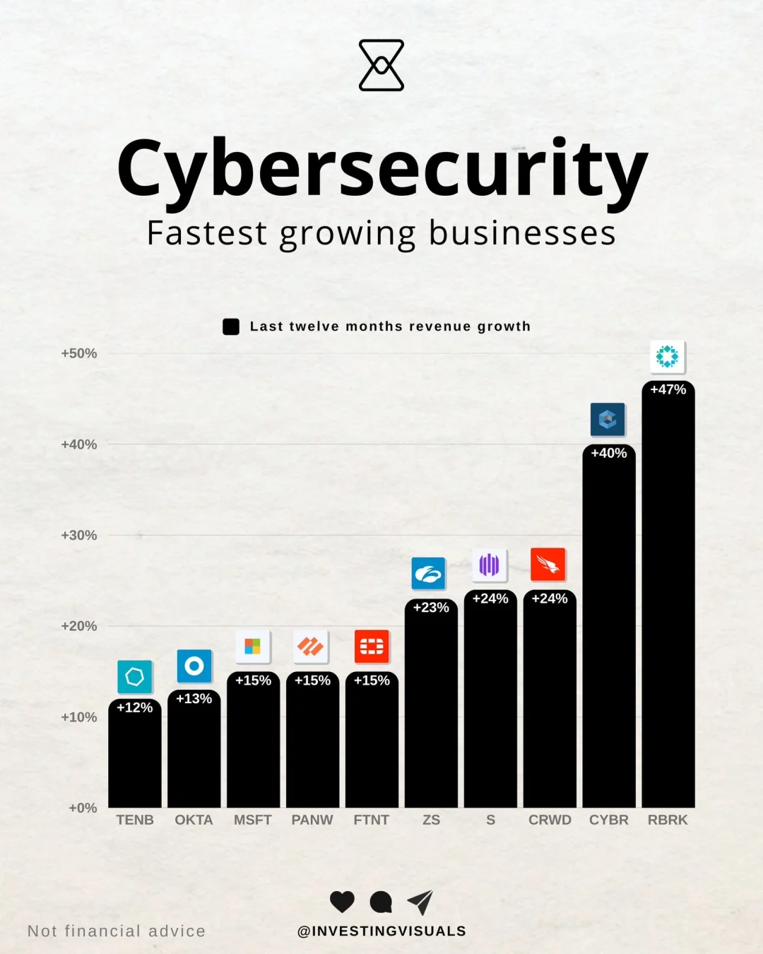 🔒这张图表展示了过去12个月全球网络安全公司收入增长的最新排名。数据显示,行业整体持续高速扩张,而部分企业更是脱颖而出。