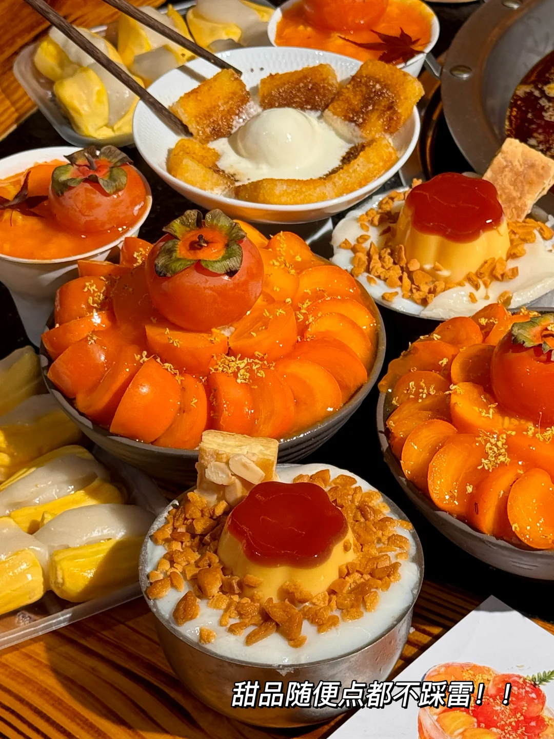 这个朱古力冰激凌布丁 可可味香浓细腻 布丁duang到没边~真的不要太绝…柿子雪冰😭香甜解辣一定要试试!还有蛋奶布丁冰沙、菠萝蜜麻薯…各种甜品小吃不输外面的专门店!