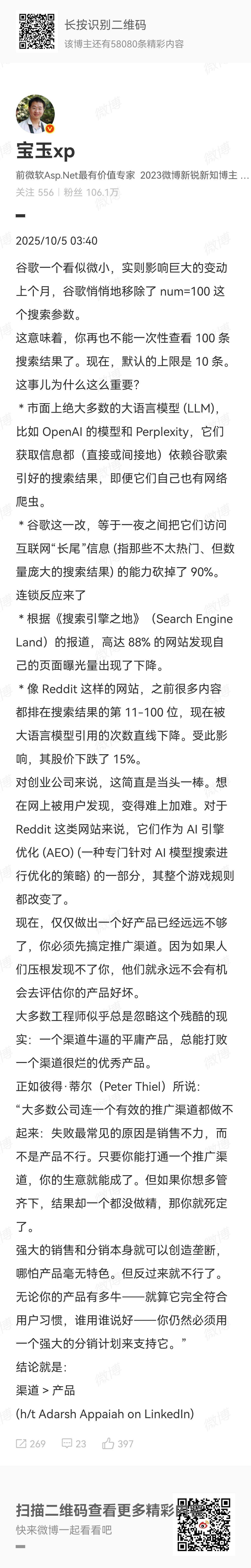 对于做产品的朋友来说,这篇文章比较有用,分享给大家:谷歌上个月移除 num=100这个搜索参数,默认的上限是10,意思是以前搜索带来的曝光率是100,现在是10(可以用我们常说的颗粒度来理解),即曝光率大大降低,推广率大大降低。如果是一个新产品,以前你的同类产品就算有100个,你也可能被看见,而现在看不见了,没有渠道来展示你的产品,大家更不会关注到你的新产品。意思是无论AI技术如何升级换代,用户需要的是产品,而产品是通过渠道(比如今日头条、抖音、快手等)展示出去的,首相要解决的是推广渠道。