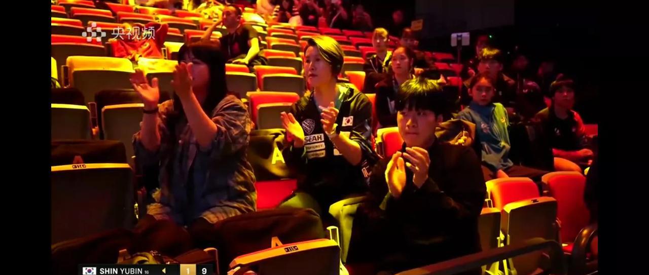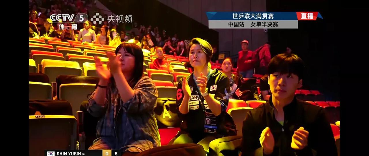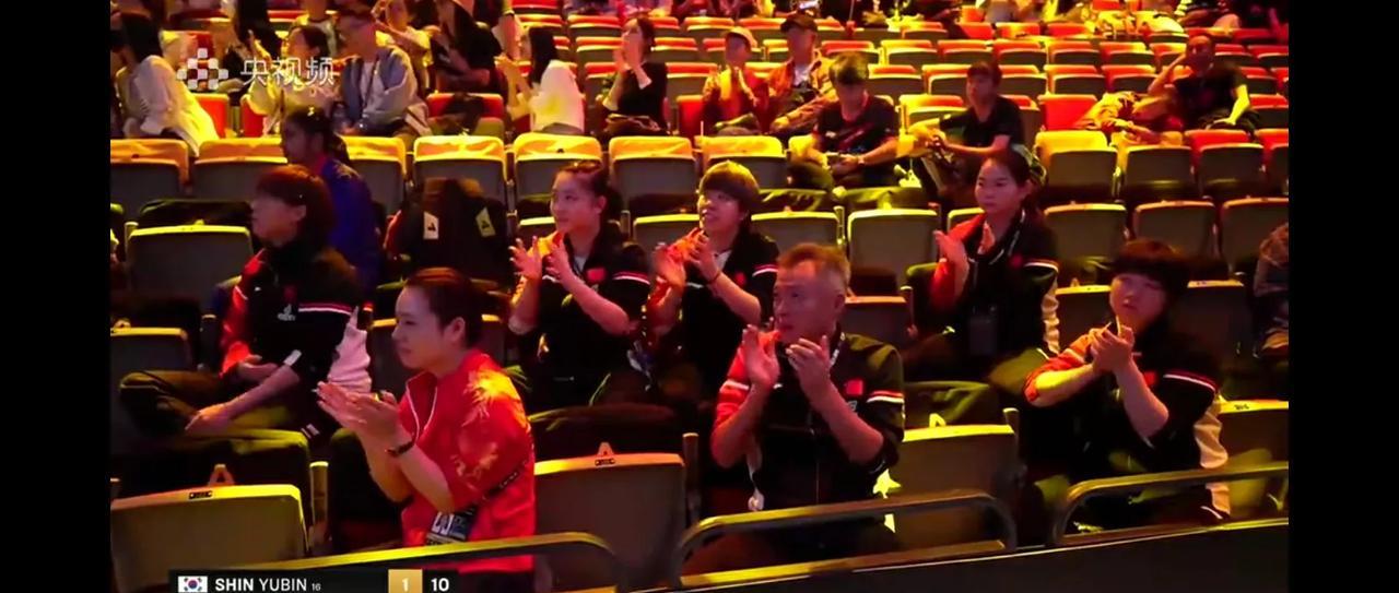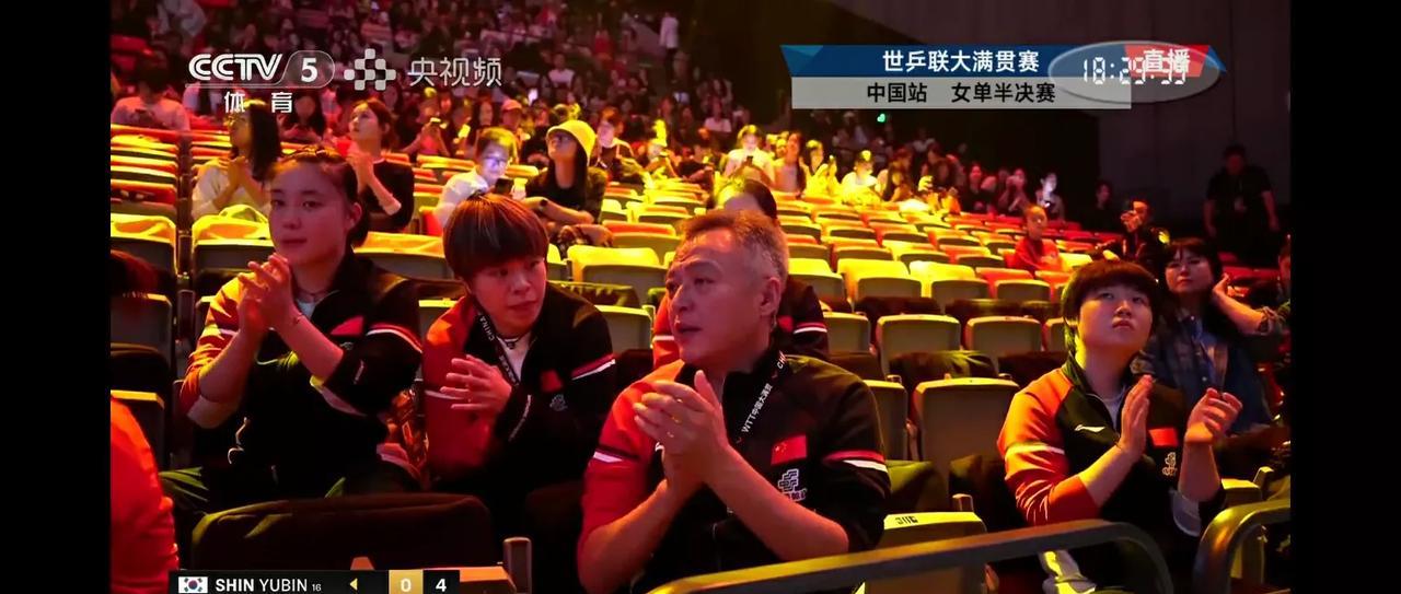 北满女双半决赛,王曼昱对申裕斌,中韩大战,比赛时镜头多次给到了各自的观赛人员,申