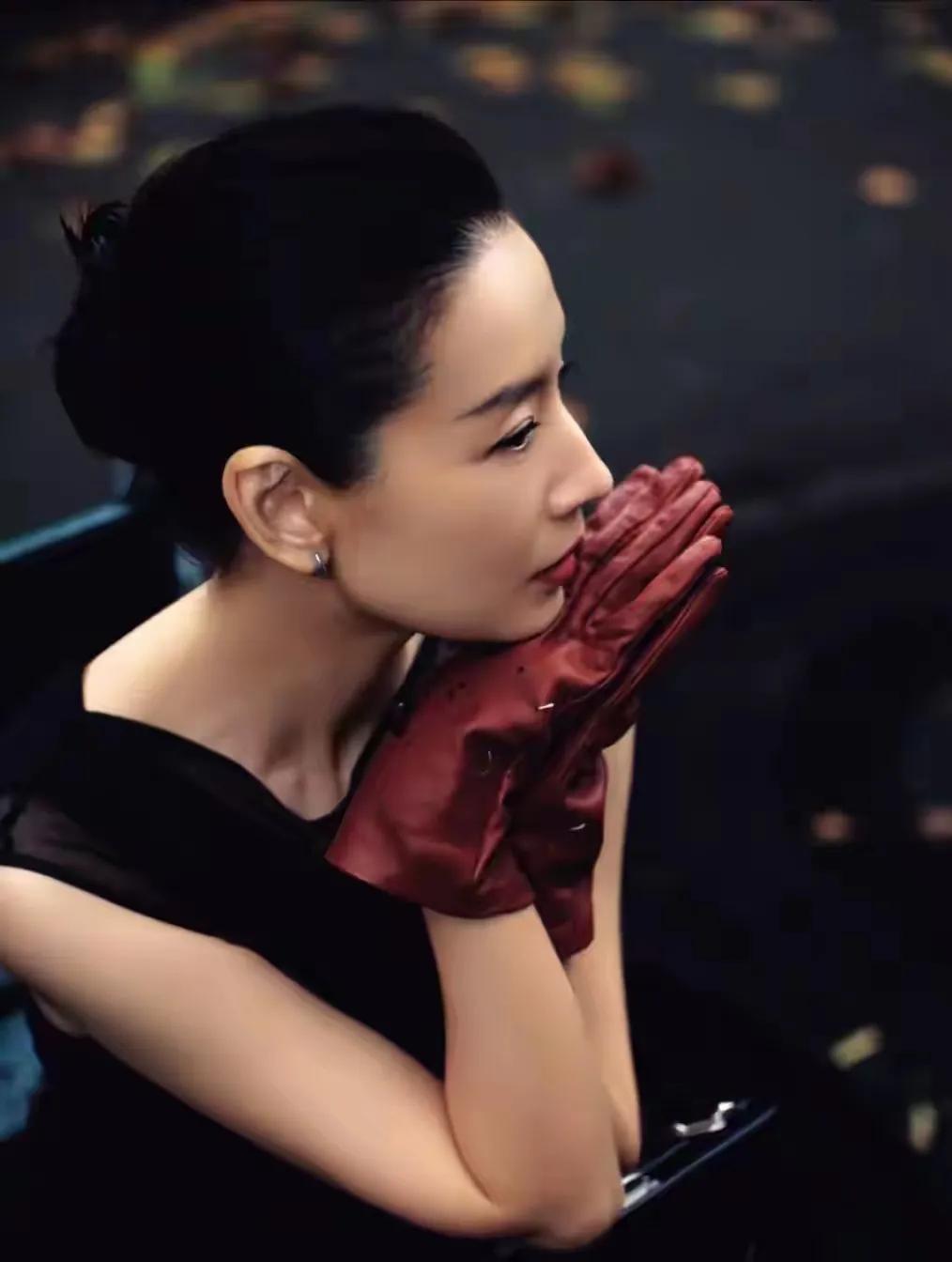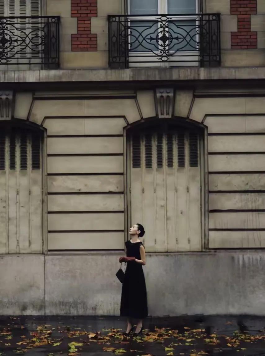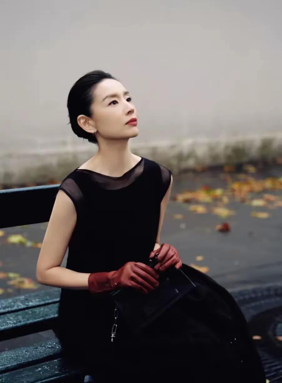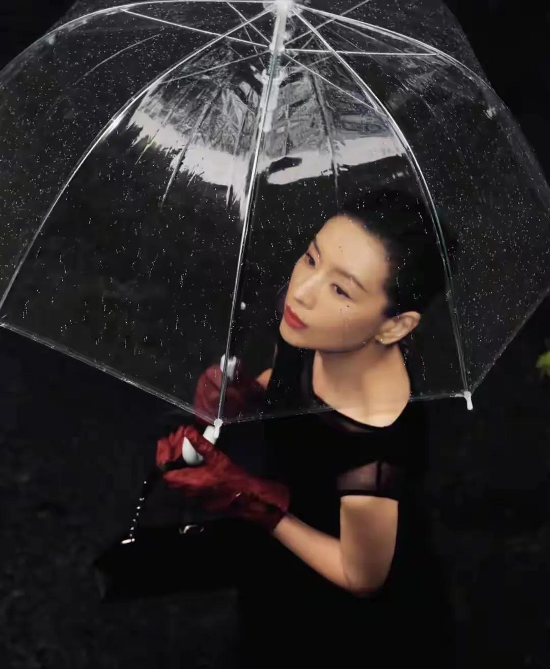 雨中的巴黎,董洁撑着透明雨伞缓缓漫步。一身黑裙衬得她气质优雅,红手套与红唇相呼应