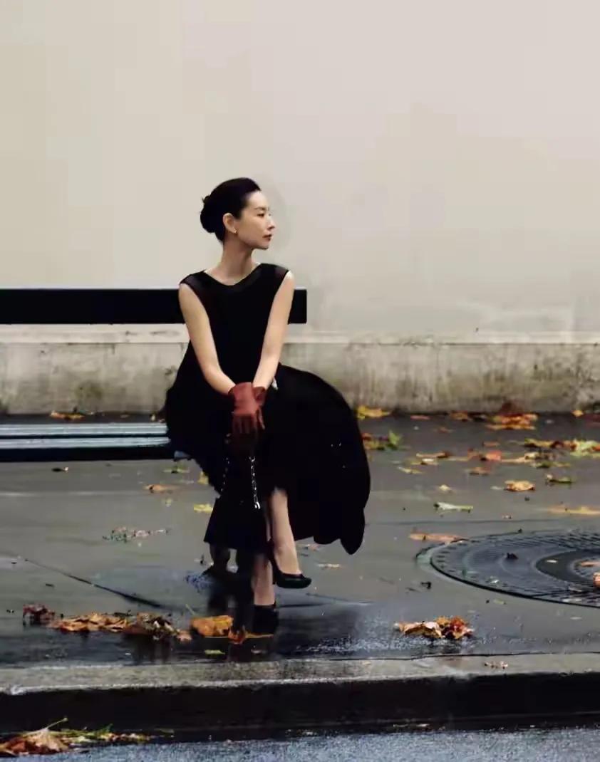 雨中的巴黎,董洁撑着透明雨伞缓缓漫步。一身黑裙衬得她气质优雅,红手套与红唇相呼应,在朦胧雨景里,宛如从复古电影中走出的佳人。