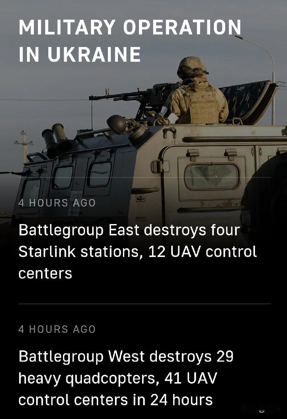俄东部作战集群摧毁4个“星链”站、12个无人机控制中心 10月5日,塔斯社消息,俄罗斯东部作战集群新闻中心负责人阿列克谢·雅科夫列夫报告称,过去24小时内,该集群军人摧毁了乌克兰武装部队的4个“星链”通信站和12个无人机控制中心。 他说,“在过去一天中,敌人损失了4个‘星链’卫星通信站和12个无人机控制中心。” 雅科夫列夫补充道,该集群的战士继续在特别军事行动区执行作战任务。 周日,西部作战集群新闻中心负责人伊万·比格马报告称,过去24小时内,该集群军人摧毁了乌克兰武装部队的29架重型作战四旋翼无人机和41个无人机控制中心。 他说,“防空部队和机动火力小组击落了9架固定翼无人机、29架重型作战四旋翼无人机、1枚海马斯多管火箭炮炮弹和3枚制导航空炸弹。此外,还发现并摧毁了41个无人机控制中心、5个电子战站和5个‘星链’通信卫星终端。” 他补充道,还摧毁了5门迫击炮,有2名乌克兰武装分子投降。