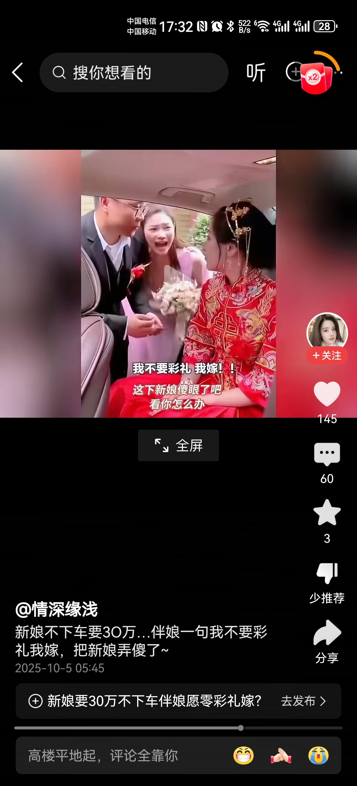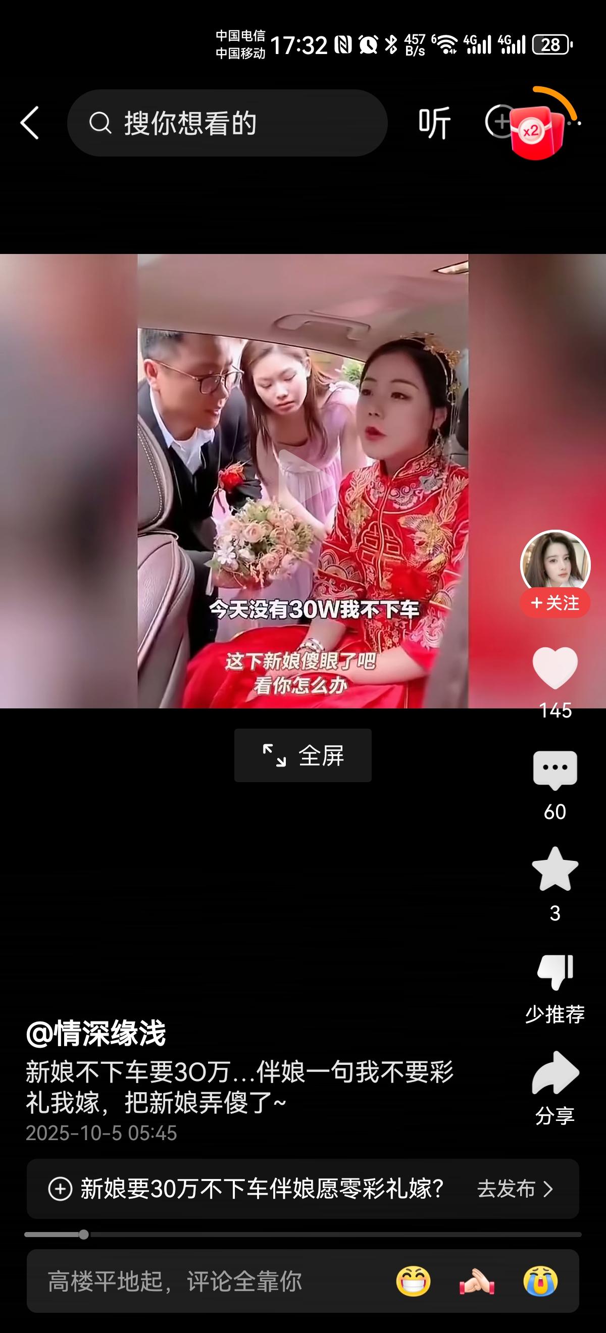 新娘真会做生意?这是嫁人还是卖人? 下车礼都要30万? 没有30万坚决不下车! 说实话,这婚车到新郎家还要下车礼,没有下车礼坚决不下车,这样的新娘真的真的太会做生意了。 婚车到新郎家了,说明新娘提的要求新郎都满足她了,都到了这一步了,下个车还得加价,不加都不行? 伴娘一句话不知道打了多少新娘的脸? “我不要彩礼,我嫁!” 结婚要的是以后的日子怎么过?这个男人值得嫁吗?值得那就嫁,不值得还会到这一步?到了这一步,新娘还加价,即便这是生意,能做好也是奇了怪了! 为这个伴娘点赞。 友友们,感觉这个新娘如何?伴娘如何?可以评论区分享分享!婚礼接车