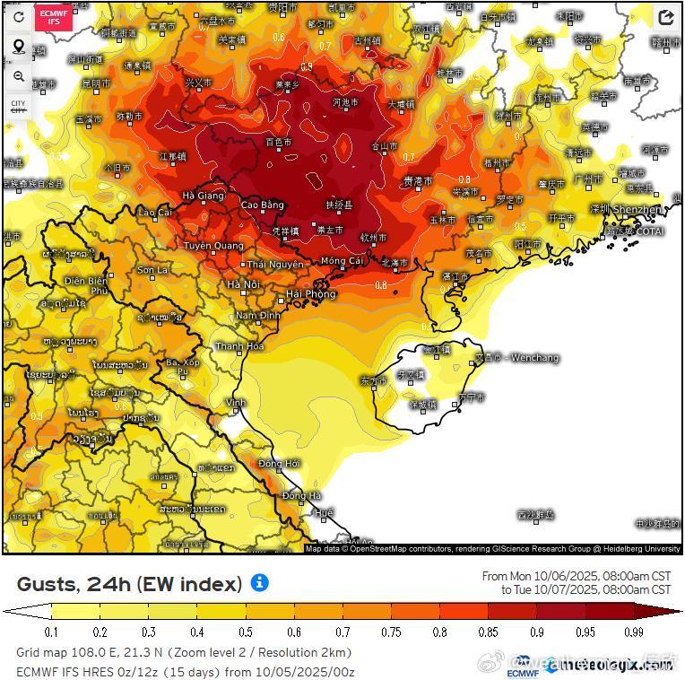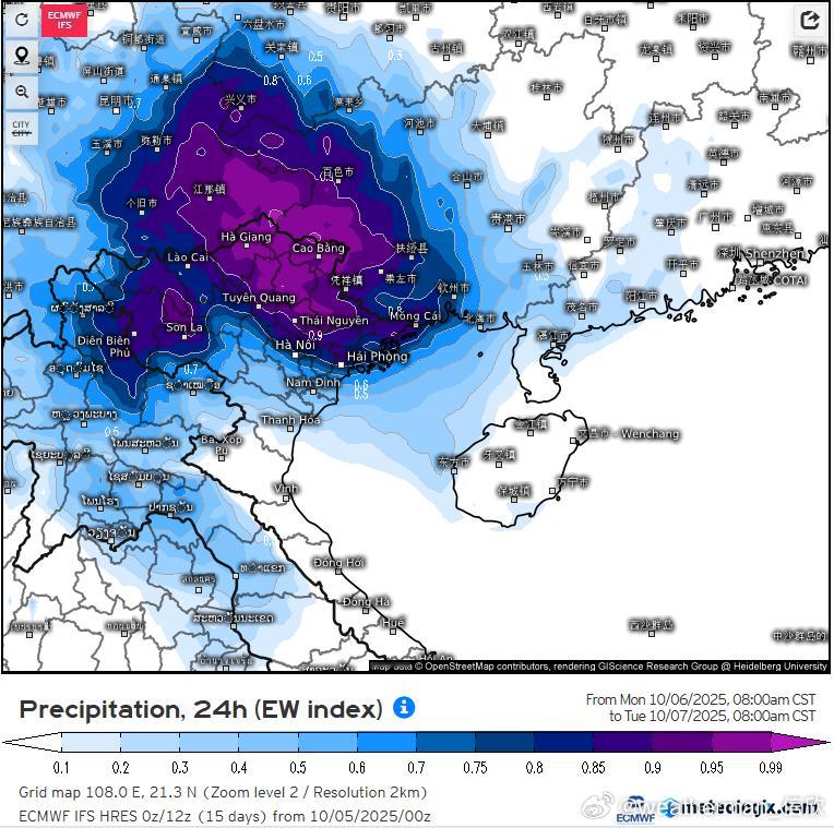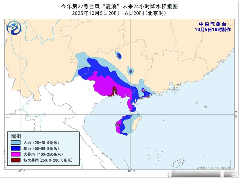 降水预报:10月5日20时至6日20时,海南岛中西部、广东西南部、广西南部和西部等地部分地区有暴雨到大暴雨,局地特大暴雨(250-280毫米)。 按照6日白天-7日晨时段统计,广西和云南东南部一带风雨具有一定的极端性。