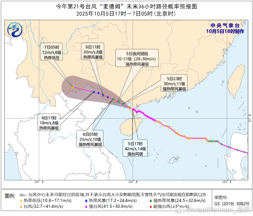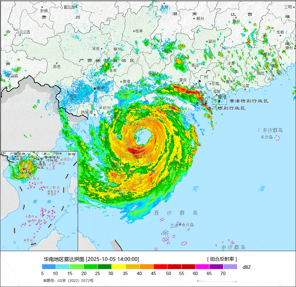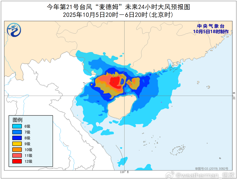 大风预报:10月5日20时至6日20时,南海西北部、北部湾、琼州海峡、广西南部及沿海、广东西南部及沿海、海南岛沿海将有6-8级、阵风9-10级的大风,其中,台风中心经过的附近海域或地区风力有9-11级、阵风12-13级。