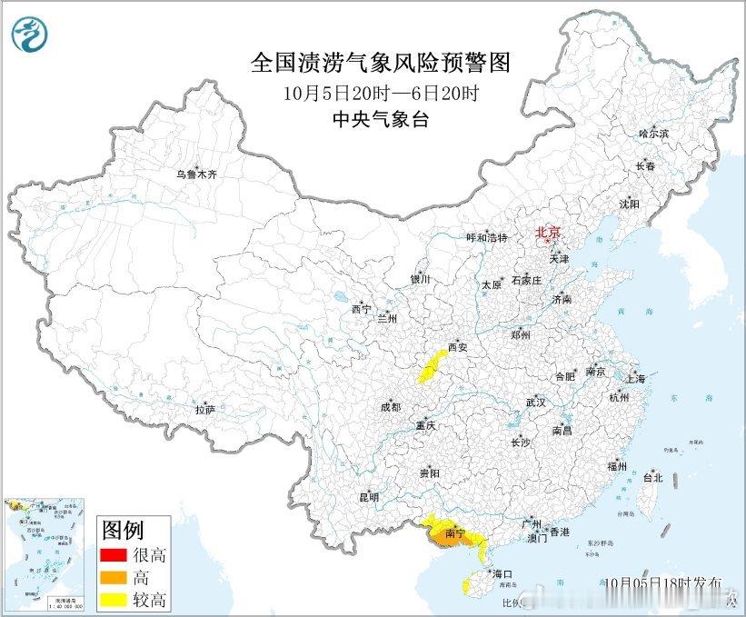 另外在强降雨的影响下,预计,10月5日20时至6日20时,广东西南部、广西西部和南部、四川东北部、陕西南部等地部分地区发生山洪灾害可能性较大,其中,广西南部等地部分地区发生山洪灾害可能性大。