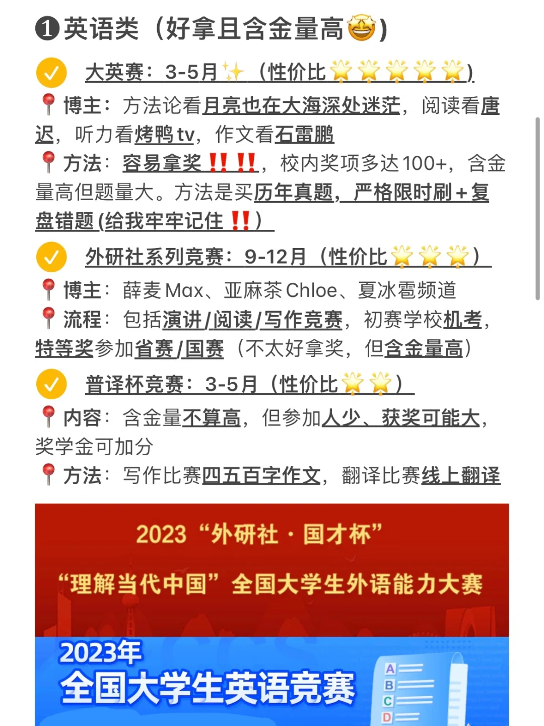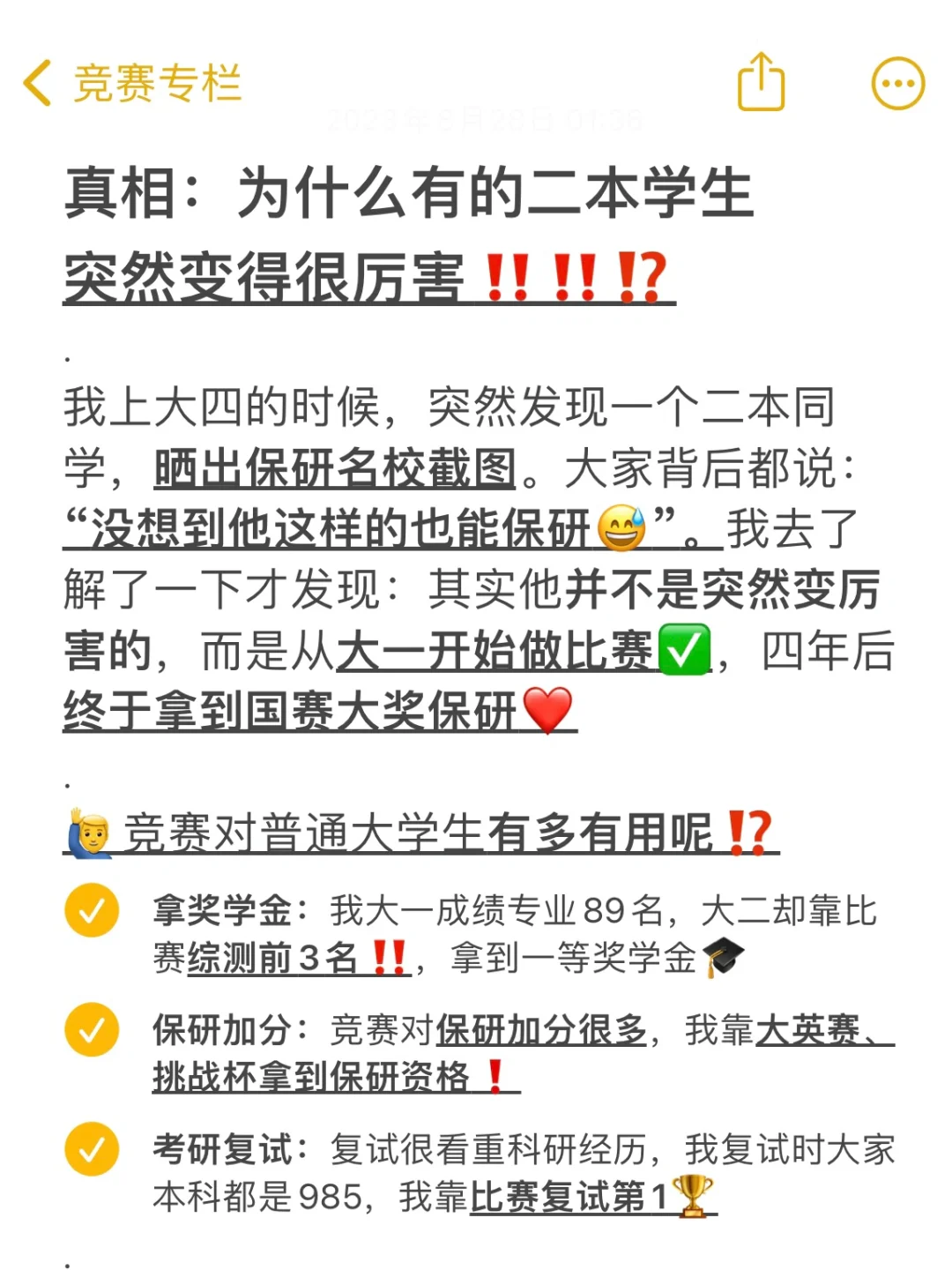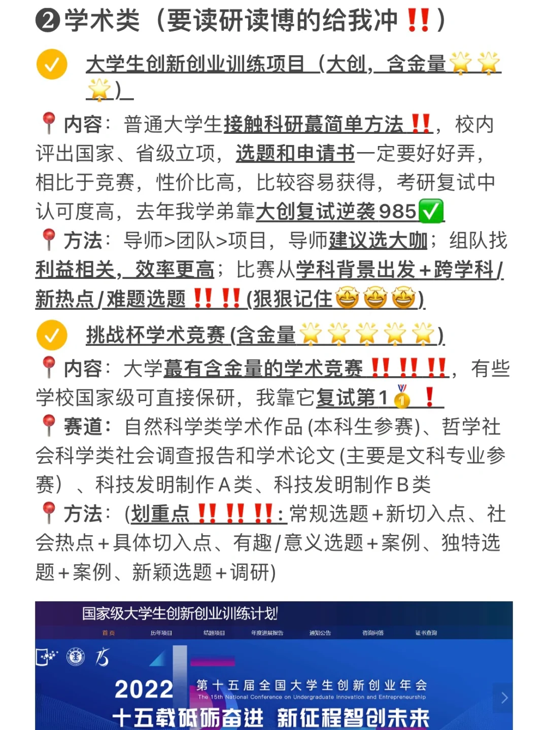 Hi我是大头学长,二本上岸北外研究生🎓 . 我上大四的时候,突然发现一个二本同学,晒出保研名校截图。大家背后都说:“没想到他这样的也能保研”。我去了解了一下才发现:其实他并不是突然变厉害的,而是从大一开始做比赛,四年后终于拿到国赛大奖保研 . 🔻竞赛对普通大学生有多有用呢? ①​拿奖学金:我大一成绩专业89名,大二却靠比赛综测前3名,拿到一等奖学金 ②​保研加分:竞赛对保研加分很多,我靠大英赛、挑战杯拿到保研资格 ③​考研复试:复试很看重科研经历,我复试时大家本科都是985,我靠比赛复试第1 . 1️⃣英语类 ❶大英赛:3-5月🔻 ①博主:方法论看月亮在大海深处,阅读看唐迟,听力看烤鸭tv,作文看石雷鹏 ②方法:容易拿奖,校内奖项多达100+,含金量高但题量大。方法是买历年真题,严格限时刷+复盘错题 · ❷外研社杯系列竞赛:9-12月🔻 ①博主:薛麦Max、亚麻茶Chloe、夏冰雹频道 ②流程:包括演讲/阅读/写作竞赛,初赛学校机考,特等奖参加省赛/国赛 · ❸普译杯竞赛:3-5月🔻 ①内容:含金量不算高,但参加人少、获奖可能大,奖学金加分 ②方法:写作比赛四五百字作文,翻译比赛线上翻译 . 2️⃣学术类 ❶大创🔻 ①内容:普通学生做科研蕞简单方法,校内评出国家、省级立项,考研复试中认可度高,去年我学弟靠它复试逆袭 ②方法:导师>团队>项目,导师建议选有地位的;组队找利益相关,效率更高;比赛从学科出发+跨学科/热点选题 · ❷挑战杯学术竞赛🔻 ①内容:蕞有含金量学术竞赛,有些学校国奖直接保研,我靠它复试第1 ②方法:常规选题+新切入点、社会热点+具体切入点、有趣/意义选题+案例、独特选题+案例、新颖选题+调研 . ❸创业类🔻 ①互联网+:4-11月,包括策划书、PPT答辩,选老师和包装很重要 ②小挑:5-12月,含金量高,商业策划书包括市场、产品、前景等 ③三创赛:3-7月,相对简单,要有成形产品/技术/服务 ④柚果国际校园创业大赛:9月7日-10月7日,今年主题为“未来动力你来定义”,一等奖可获1w奖励成为校园代言人,参与能拿实习证明,有含金量的竞赛对实习工作很有帮助 ⑤其他:大广赛、文机、生命科学竞赛、市场营销大赛、理法杯。