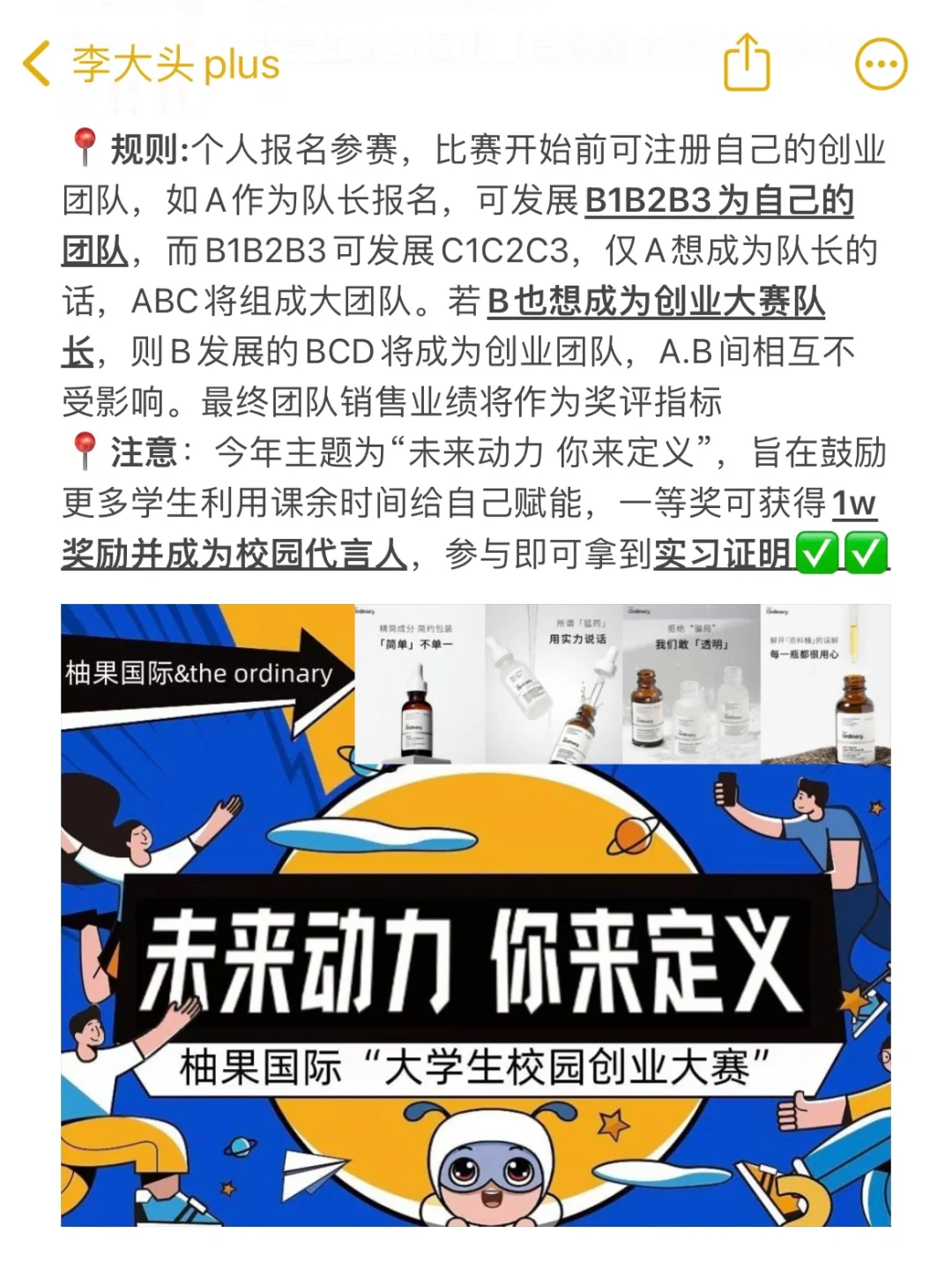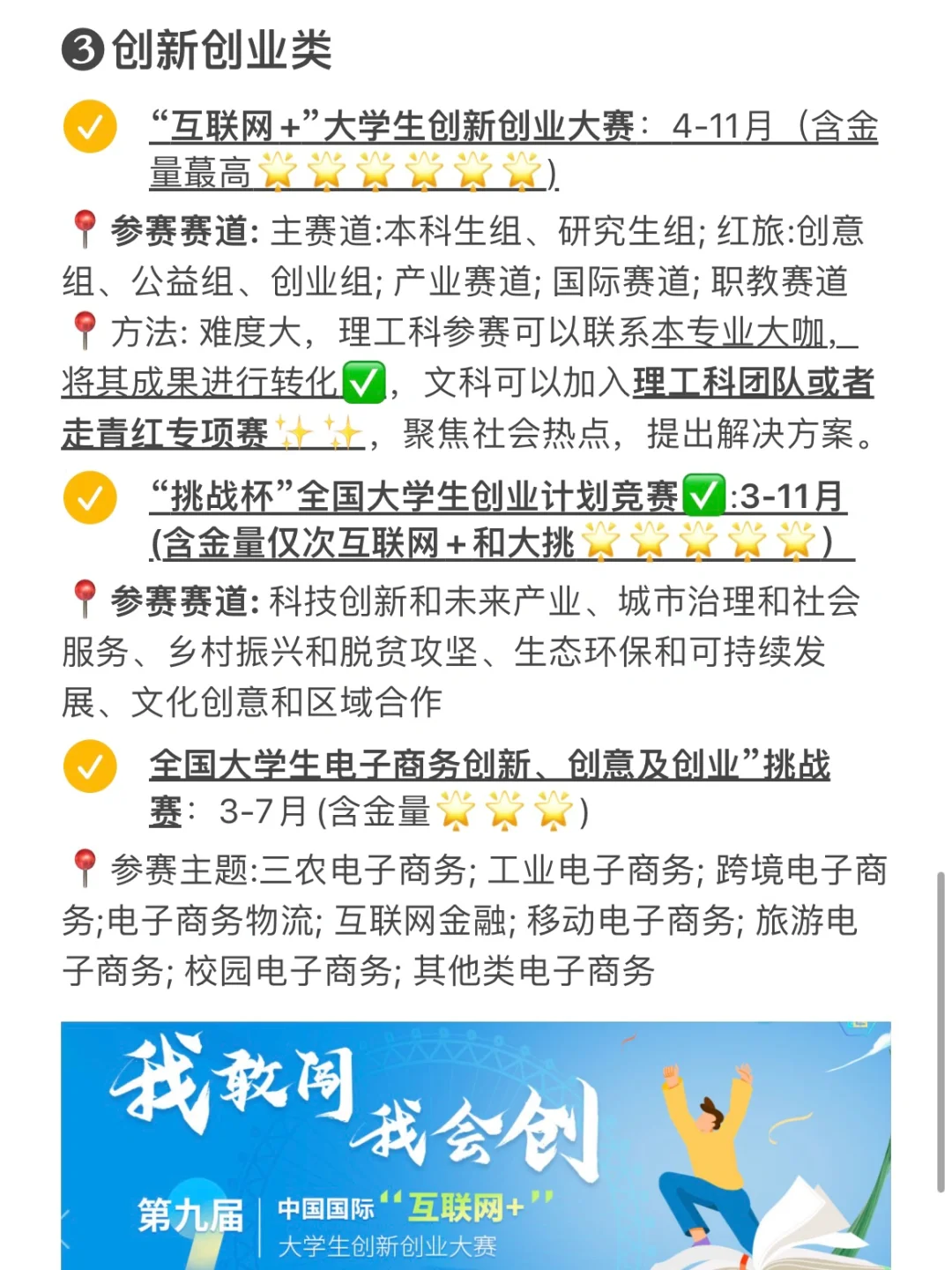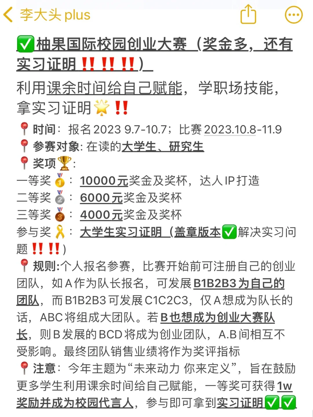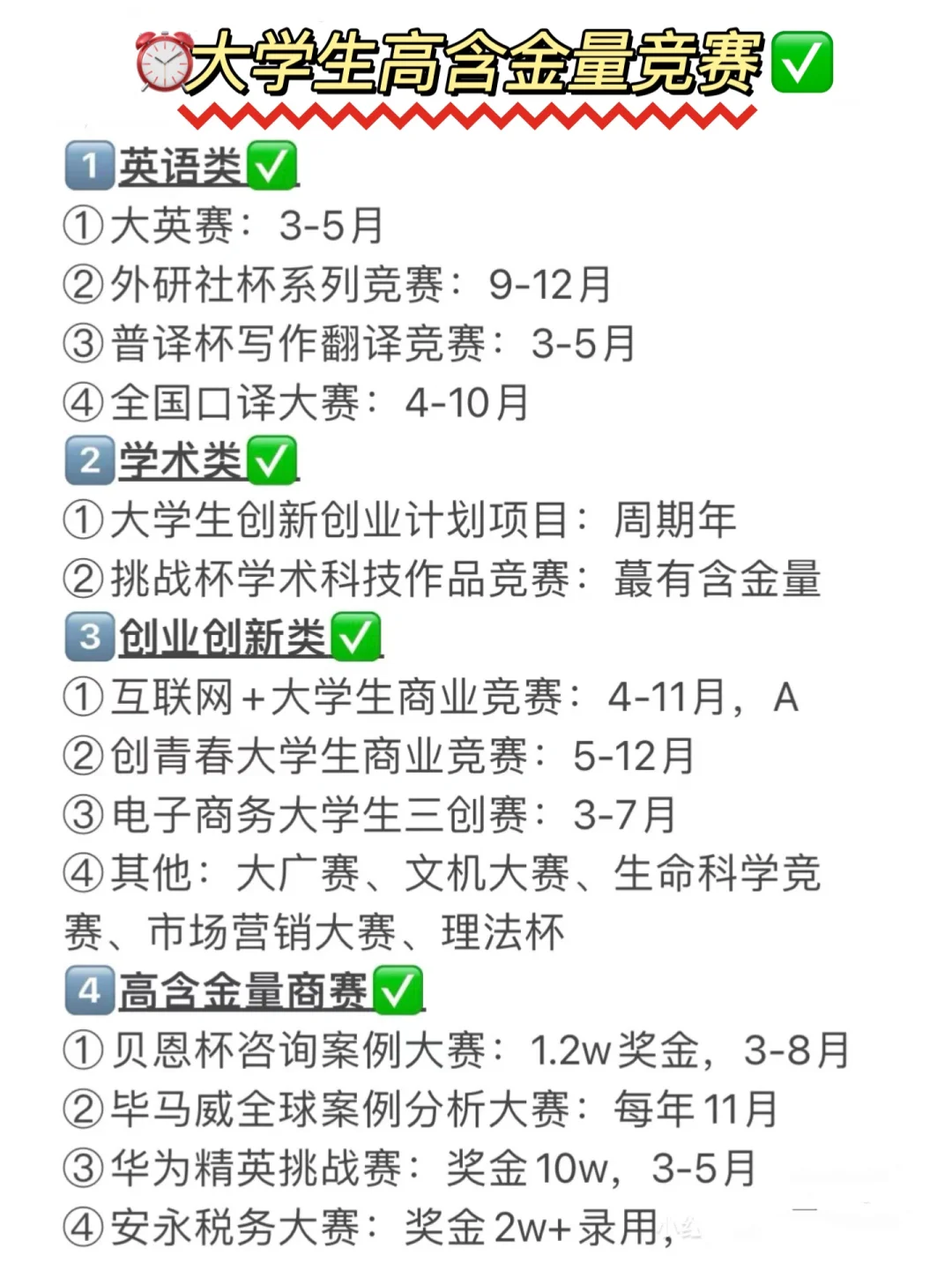 Hi我是大头学长,二本上岸北外研究生🎓 . 我上大四的时候,突然发现一个二本同学,晒出保研名校截图。大家背后都说:“没想到他这样的也能保研”。我去了解了一下才发现:其实他并不是突然变厉害的,而是从大一开始做比赛,四年后终于拿到国赛大奖保研 . 🔻竞赛对普通大学生有多有用呢? ①​拿奖学金:我大一成绩专业89名,大二却靠比赛综测前3名,拿到一等奖学金 ②​保研加分:竞赛对保研加分很多,我靠大英赛、挑战杯拿到保研资格 ③​考研复试:复试很看重科研经历,我复试时大家本科都是985,我靠比赛复试第1 . 1️⃣英语类 ❶大英赛:3-5月🔻 ①博主:方法论看月亮在大海深处,阅读看唐迟,听力看烤鸭tv,作文看石雷鹏 ②方法:容易拿奖,校内奖项多达100+,含金量高但题量大。方法是买历年真题,严格限时刷+复盘错题 · ❷外研社杯系列竞赛:9-12月🔻 ①博主:薛麦Max、亚麻茶Chloe、夏冰雹频道 ②流程:包括演讲/阅读/写作竞赛,初赛学校机考,特等奖参加省赛/国赛 · ❸普译杯竞赛:3-5月🔻 ①内容:含金量不算高,但参加人少、获奖可能大,奖学金加分 ②方法:写作比赛四五百字作文,翻译比赛线上翻译 . 2️⃣学术类 ❶大创🔻 ①内容:普通学生做科研蕞简单方法,校内评出国家、省级立项,考研复试中认可度高,去年我学弟靠它复试逆袭 ②方法:导师>团队>项目,导师建议选有地位的;组队找利益相关,效率更高;比赛从学科出发+跨学科/热点选题 · ❷挑战杯学术竞赛🔻 ①内容:蕞有含金量学术竞赛,有些学校国奖直接保研,我靠它复试第1 ②方法:常规选题+新切入点、社会热点+具体切入点、有趣/意义选题+案例、独特选题+案例、新颖选题+调研 . ❸创业类🔻 ①互联网+:4-11月,包括策划书、PPT答辩,选老师和包装很重要 ②小挑:5-12月,含金量高,商业策划书包括市场、产品、前景等 ③三创赛:3-7月,相对简单,要有成形产品/技术/服务 ④柚果国际校园创业大赛:9月7日-10月7日,今年主题为“未来动力你来定义”,一等奖可获1w奖励成为校园代言人,参与能拿实习证明,有含金量的竞赛对实习工作很有帮助 ⑤其他:大广赛、文机、生命科学竞赛、市场营销大赛、理法杯。