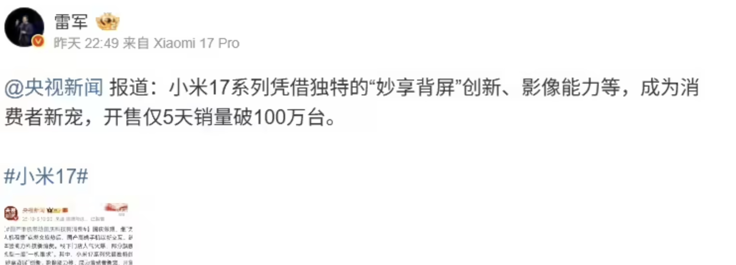 央视新闻报道,小米 17 系列手机开售仅 5 天销量破 100 万台,雷军本人进行了转发确认。