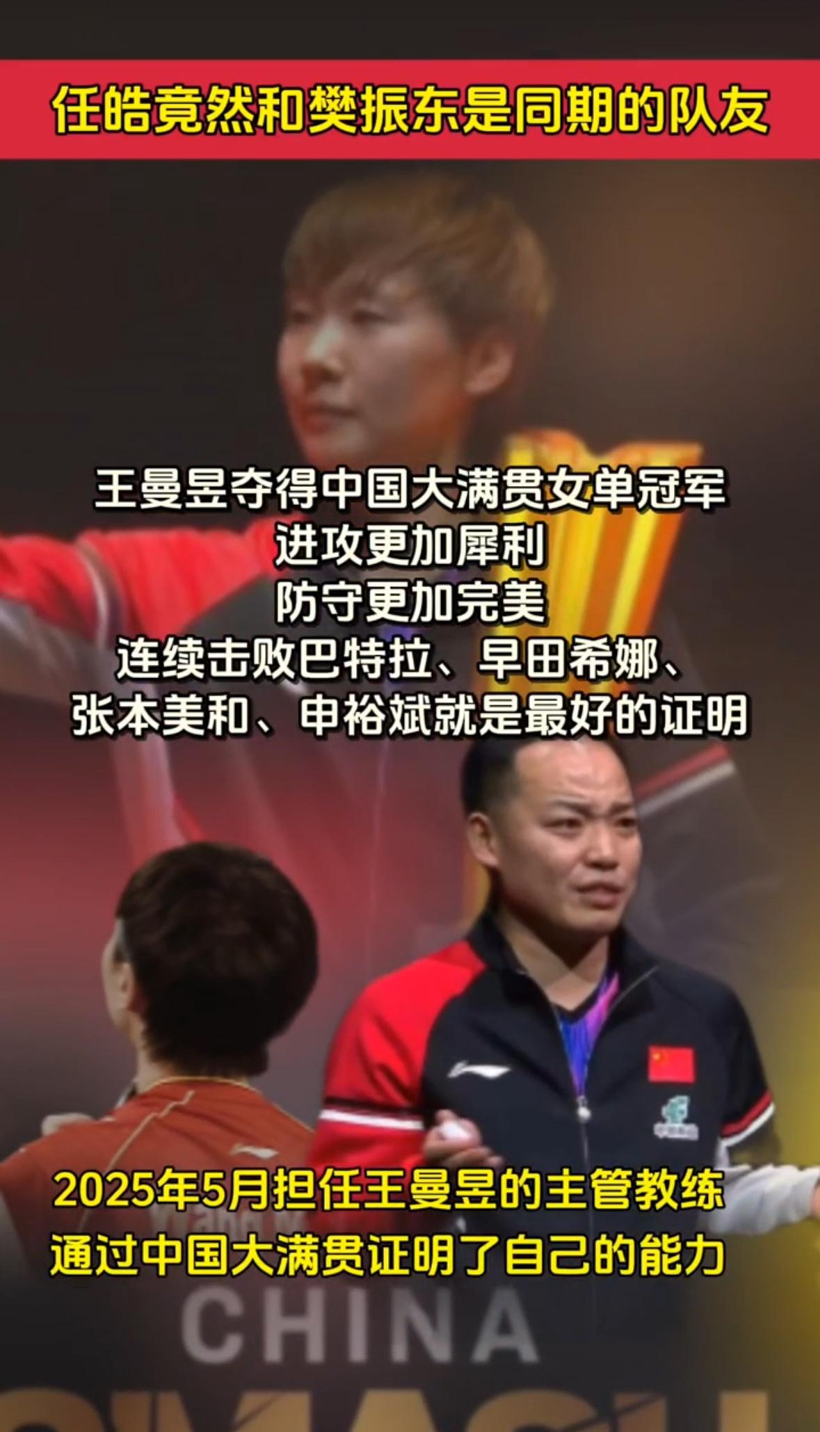 王曼昱夺冠,背后有一名教练功臣吧,和樊振东同一期间的,95年的任皓,开始崭露头角了! 王曼昱打败了好几个牛人,才会更牛,连续击败印度一姐,日本一姐,韩国一姐,中国一姐,登顶还可以继续拿下,加油奥利给! 王曼昱的成功也不是一时的,这是付出了千万倍,小小的鱼儿,也是长大了,相信她和她的贵人,还会继续创造的,未来无限可期!