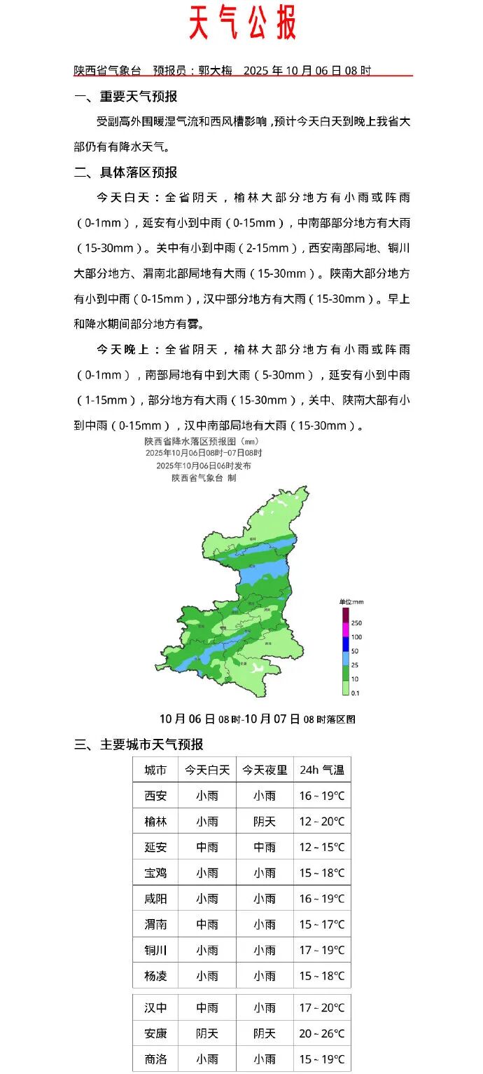 陕西省气象台2025年10月06日10时发布未来24小时灾害性天气预报:预计今天白天到晚上关中西北部、陕南部分地方及秦巴山区有雾,局地有大雾。提请相关地区密切关注天气形势,注意防范气象灾害及次生灾害,及时发布预警信号。