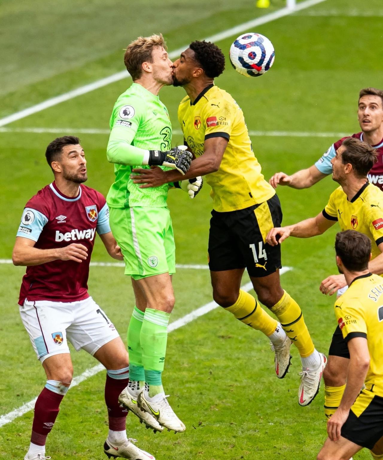 《意外》 写实摄影风格,高细节,色彩vivid,绿色足球场背景,一场充满动感的足球比赛场景,多名球员处于激烈的身体对抗中。 球员穿着不同球衣:酒红色配白色短裤的球衣、亮绿色的门将球衣、黄色的球队球衣。 一名穿着绿色球衣的球员和一名穿着黄色球衣的球员双双跳起,有很近的面部接触,彷佛意外的亲吻,足球在两人的附近,周围其他球员也在参与争抢,表情生动,姿态充满动感,捕捉足球比赛的激烈感与意外瞬间。 长宽比例为3:4。