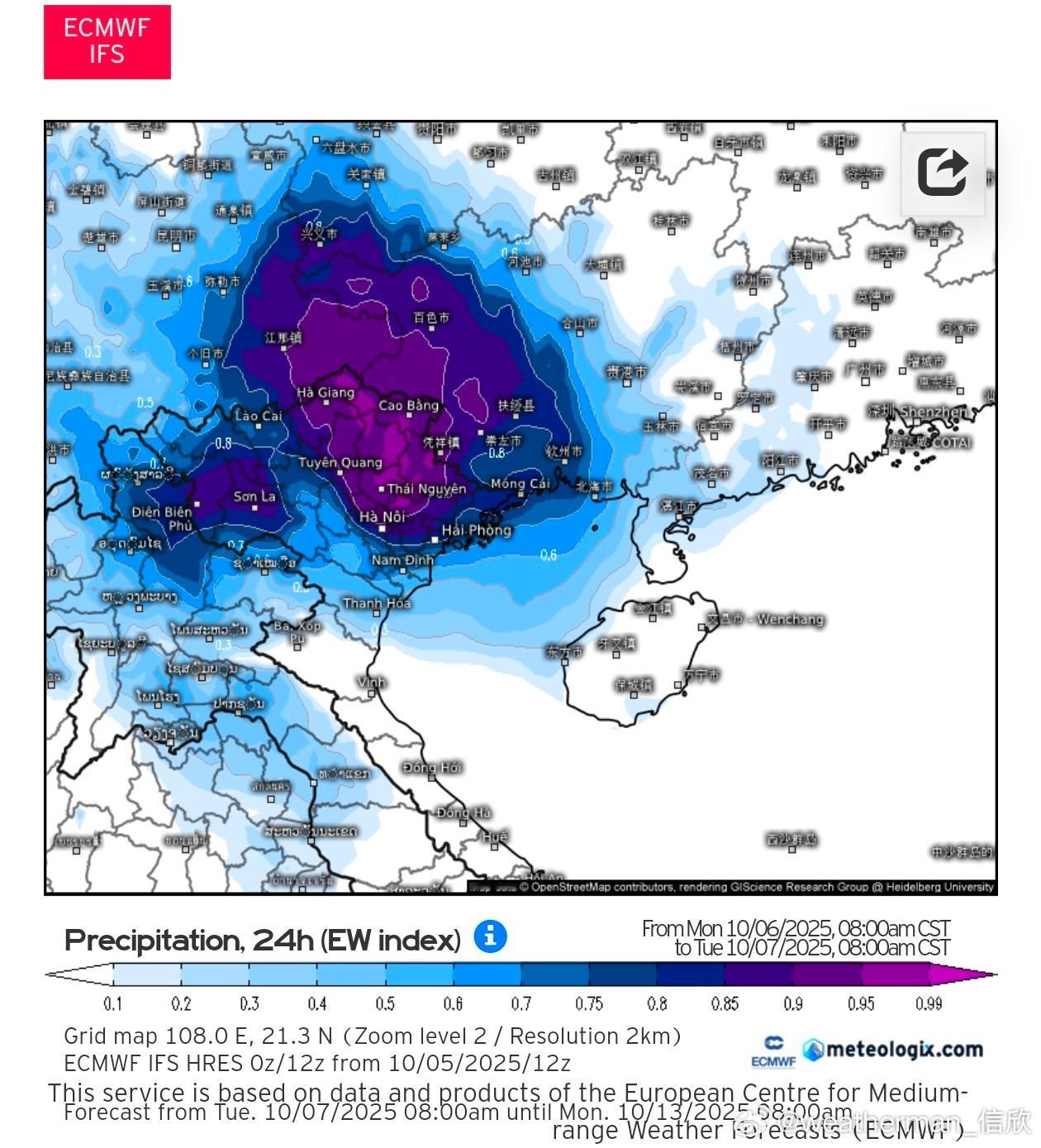 预计,10月6日08时至7日08时,广西中西部、贵州西南部、云南东南部、海南岛西部、四川盆地北部、陕西北部、山西西部等地部分地区有大到暴雨,其中,广西西部、云南东南部等地部分地区有大暴雨(100~190毫米)。从降水极端指数看,广西西部和云南东南部具有一定极端性。而且和之前台风博罗依强降雨区高度重叠,要警惕强降雨可能引发山洪、地质灾害以及中小河流洪水。