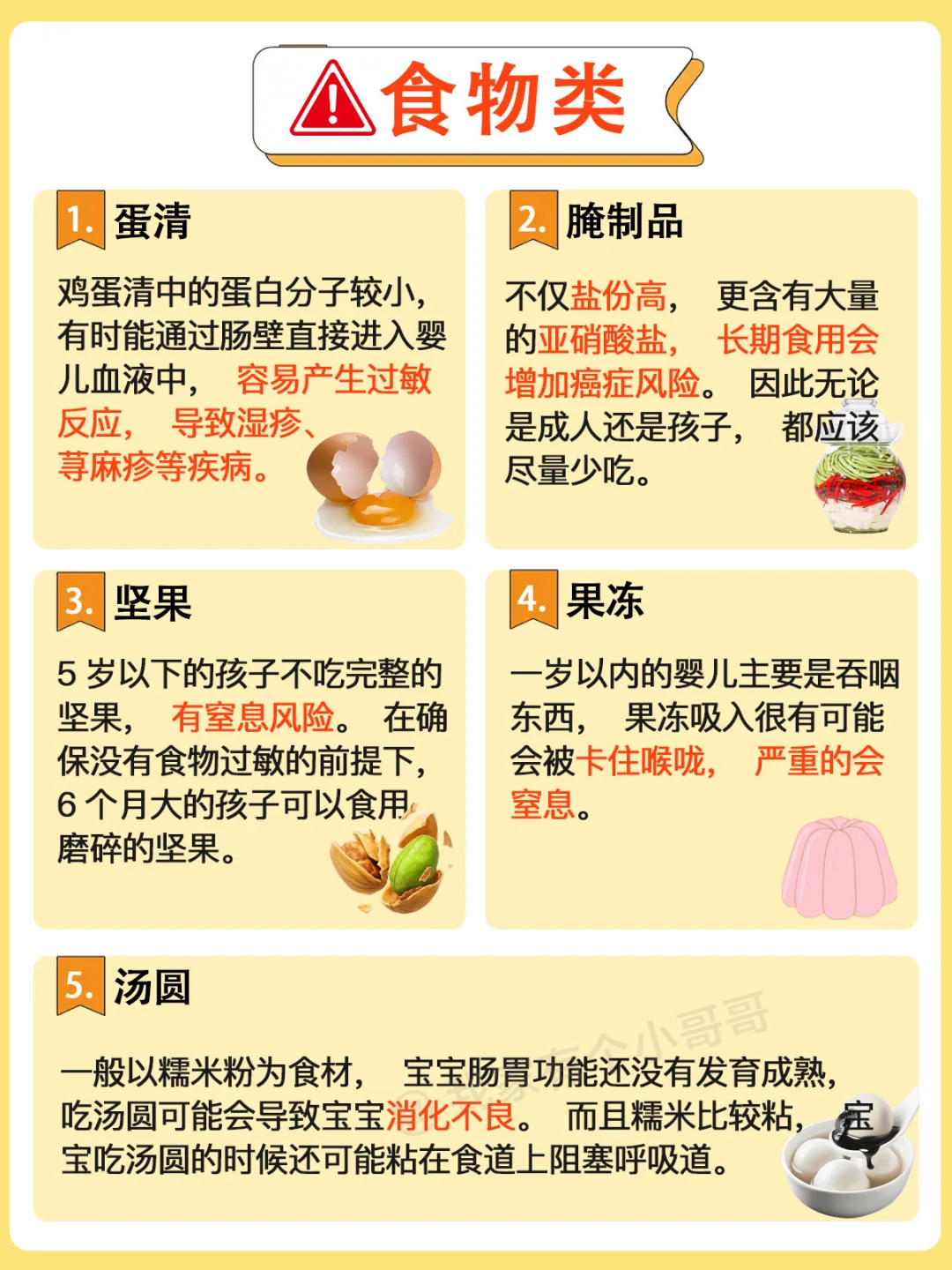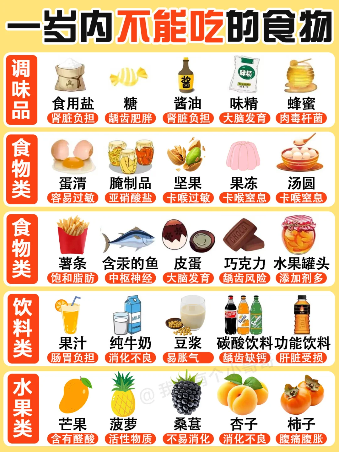 大家都知道宝宝在六个月开始添加辅食,但是宝宝消化系统还比较稚嫩,一些食物还消化不了🙅🏻♀️ 宝宝一岁之前有些食物是不可以吃的,赶紧收藏学习吧!