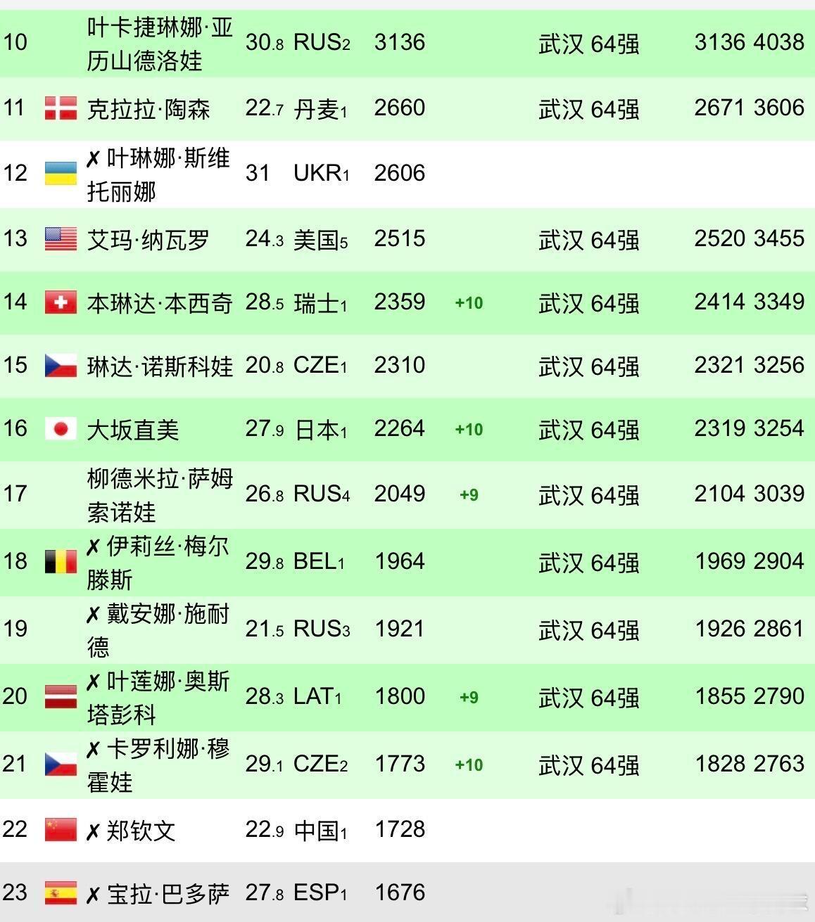 亚历山德罗娃进入前10,莱巴金娜继续第9,而郑钦文排在第11;