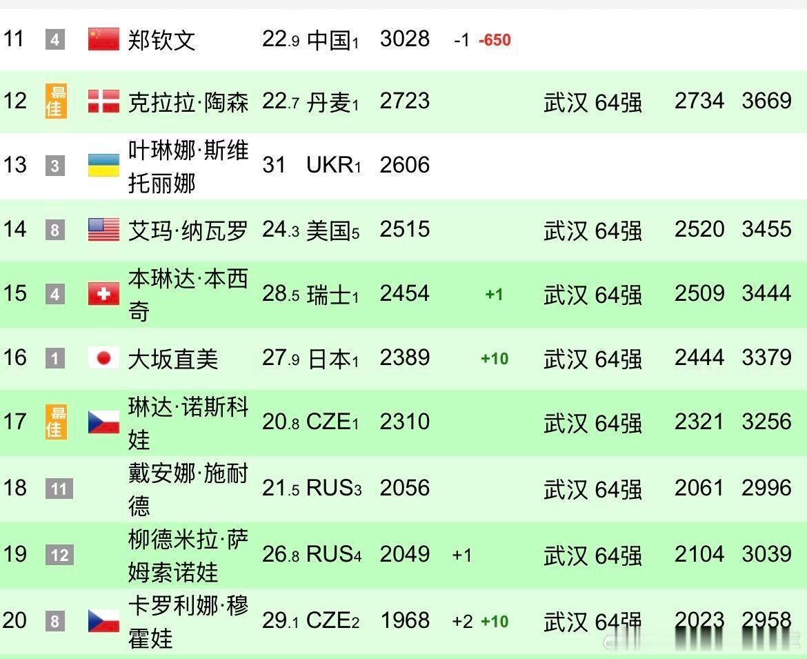 WTA最新一期排名郑钦文第11位此即时排名已扣除2024年武网积分;阿尼西莫额中
