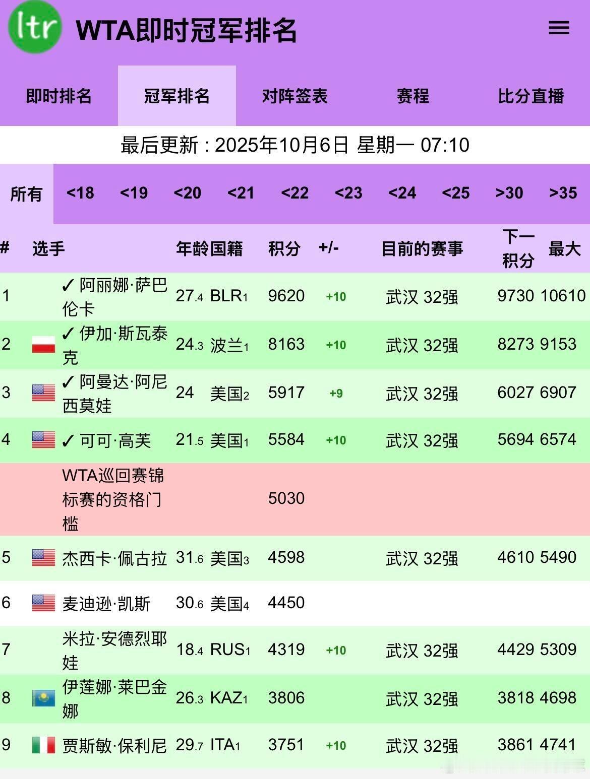 此即时排名已扣除2024年武网积分;阿尼西莫额中网折桂与排名第5的安德列娃拉开差距;