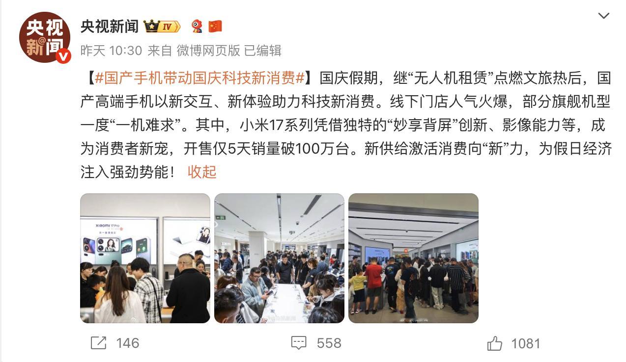 小米17系列销量破百万,而且这一次Pro Max的占比非常高,达到了一半。这个成绩是之前的小米也没有达到过的,在九月份直面新iPhone 的背景下还能取得这样的成绩,看来消费市场对于小米17系列的背屏和产品力是非常认可的!科技创新激发消费活力