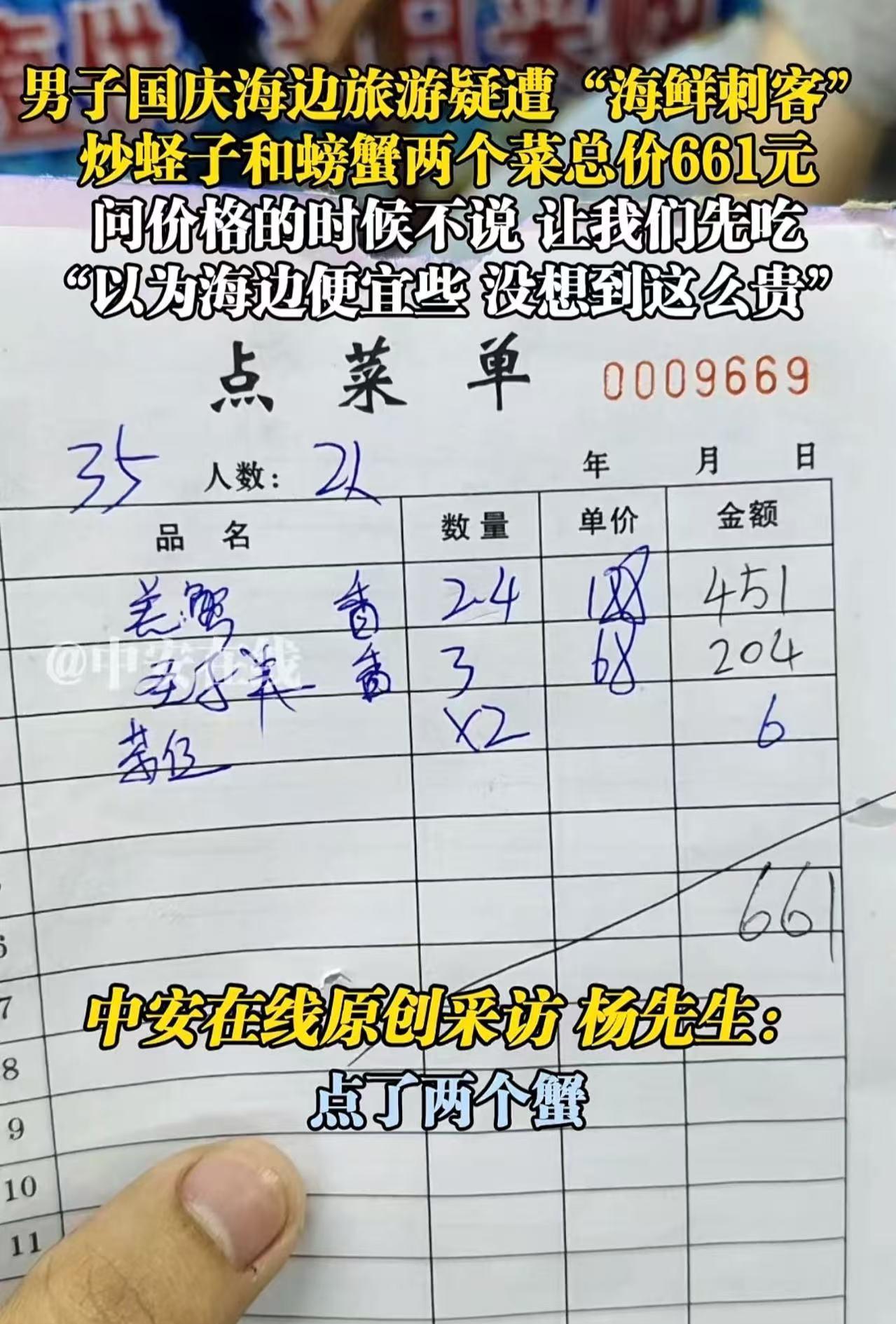 “一家店,凭一己之力砸了广东的招牌!”男子国庆去广东海边旅游,点了一盘炒蛏子和2只螃蟹,竟被收661元!男子:“问价格的时候不说,让我们先吃,以为海边便宜些,没想到这么贵!”网友:太狠了,这种蛏子我们这边菜市场12块钱一斤! (来源:中安在线) 国庆假期,杨先生带着妻子来到海边旅游。到了饭点,精打细算的杨先生想着团购一个实惠点的套餐,既能品尝到当地的海鲜美食,又不会花费太多。 然而,当他和妻子来到店里,却被告知团餐团购的时间已经过了,只能选择单点。 杨先生觉得换店麻烦,就我呢老板单点的价格是否和团购一样便宜? 老板却只是含糊其辞地说:“你先点。” 杨先生点了两个螃蟹,就在他还在纠结再点什么菜的时候,老板热情地推荐道:“蛏子要不要?行不行。” 杨先生想着来都来了,就尝尝当地特色的蛏子吧,于是说:“那就这样吧,这样多少钱?我先结账。” 可老板却一脸不在意地说:“你先吃吧,吃完再结账。” 杨先生心想,海边的海鲜应该价格比较亲民,不会太贵,便没有多想,安心地等待菜上桌。 吃完以后,杨先生喊老板结账,当老板说出“两个菜661块”时,杨先生瞬间惊呆了。 他原本以为撑死也就200块钱,现在这价格比他预想的贵了几倍不止。 他仔细看了看账单,螃蟹2.4斤,每斤188元,总共451元;蛏子3斤,每斤68元,总共204元。 杨先生越想越觉得不对劲,这种蛏子在菜市场十几块一斤,就算大排档翻倍赚,他也能接受,但卖到68元一斤,这简直就是“杀猪”啊!而且份量看起来也明显不足。 还有那小螃蟹,就算贵一点,也不至于188元一斤吧?现在想来,估计老板就是觉得自己不会吃,价格太贵肯定不会点,所以才强行留住自己,等吃完再狮子大开口。 杨先生气不过,便把这件事情发到了网上。他直言老板应该明码标价,自己吃不起可以不吃,但不能这样忽悠人、骗人吃,然后像杀猪一样宰客! 这起事件看似只是一起普通的消费纠纷,但背后却反映出商家诚信经营的缺失和消费市场监管的漏洞。 在旅游旺季,一些商家为了追求短期利益,不惜采用模糊价格、误导消费等手段来欺骗消费者。 他们以为可以趁着游客多、消费需求大,狠狠地赚一笔,却忽略了消费者的权益。 明码标价是商业经营的基本准则,是消费者知情权和选择权的重要保障。商家有义务将商品或服务的价格清晰地告知消费者,让消费者在充分了解的基础上做出消费决策。 而像这家海鲜店老板这样,先诱导消费者消费,再在结账时给出天价账单,无疑是对消费者权益的严重侵犯,也是对市场秩序的公然破坏。 从长远来看,这种宰客行为不仅会损害消费者的利益,还会影响当地的旅游形象和经济发展。游客们会因为担心被宰而对旅游地望而却步,最终导致旅游市场萎缩。 因此,相关部门必须加强市场监管,加大对宰客等违法行为的打击力度,维护市场的公平竞争和消费者的合法权益。 同时,消费者也应该增强自我保护意识,在消费前要仔细询问价格、查看菜单,避免陷入商家的消费陷阱。 只有商家诚信经营、消费者理性消费、监管部门严格执法,才能共同营造一个健康、有序的消费市场环境。